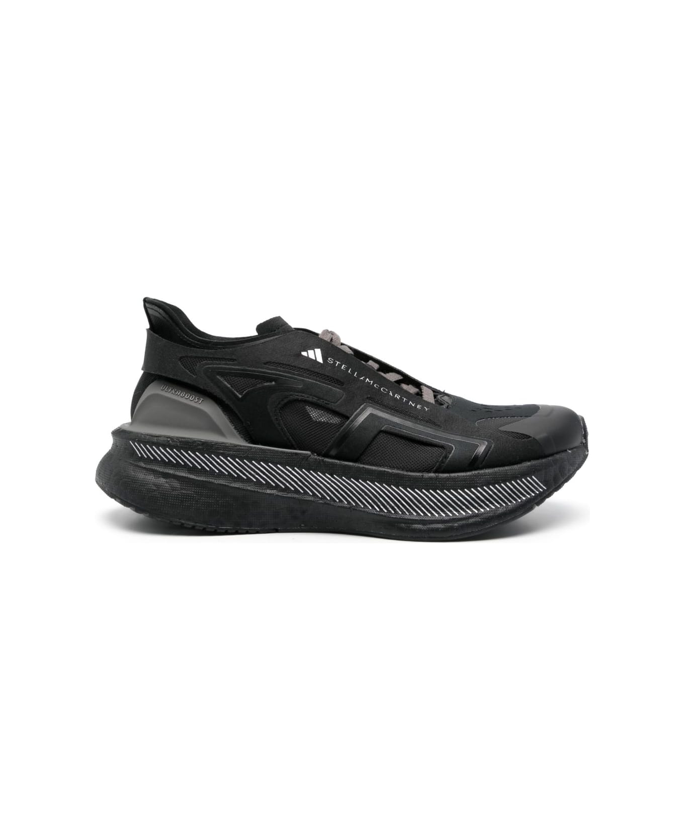 black mesh design panelled design front lace-up fastening strap detailing logo print to the side logo-print tongue perforated detailing round toe branded insole signature cushioned Boost midsole rubber outsole