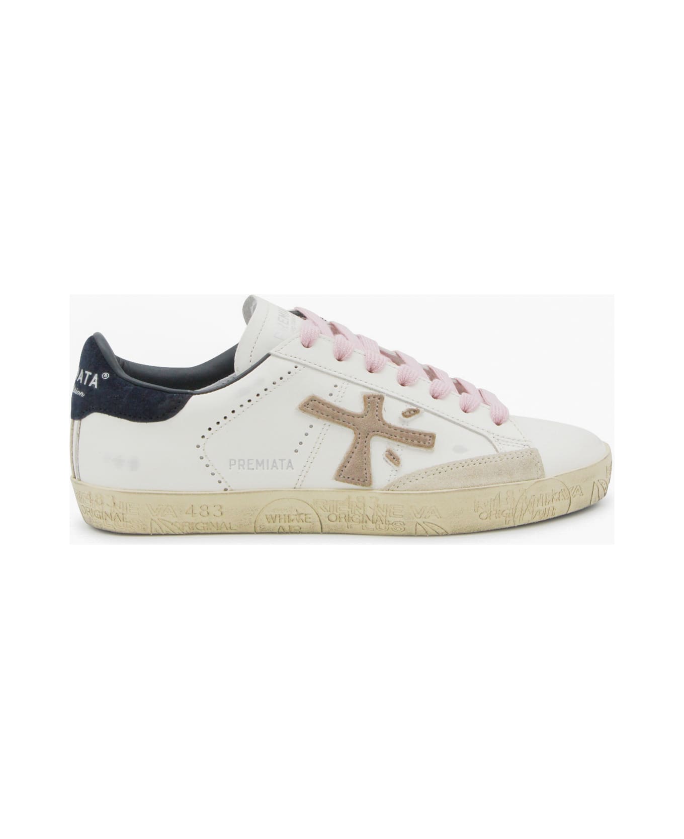 White leather Stevend sneakers from Premiata featuring round toe, laces fastening, logo, contrasting heel counter, branded insole and rubber sole.