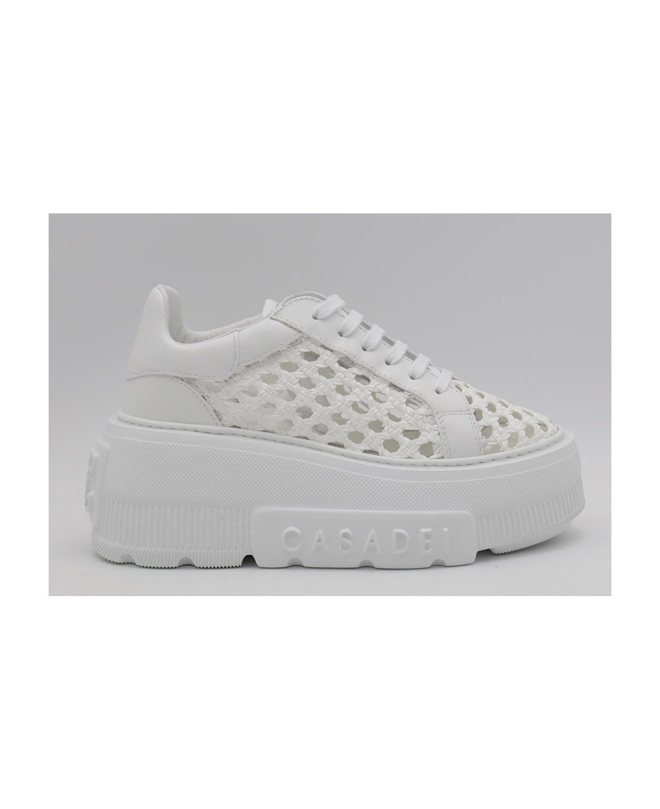 White sneakers from Casadei featuring round toe, cotton laces, lateral logo and oversize sole. Composition: _cover Tex/le Sole, 100% Elastodiene