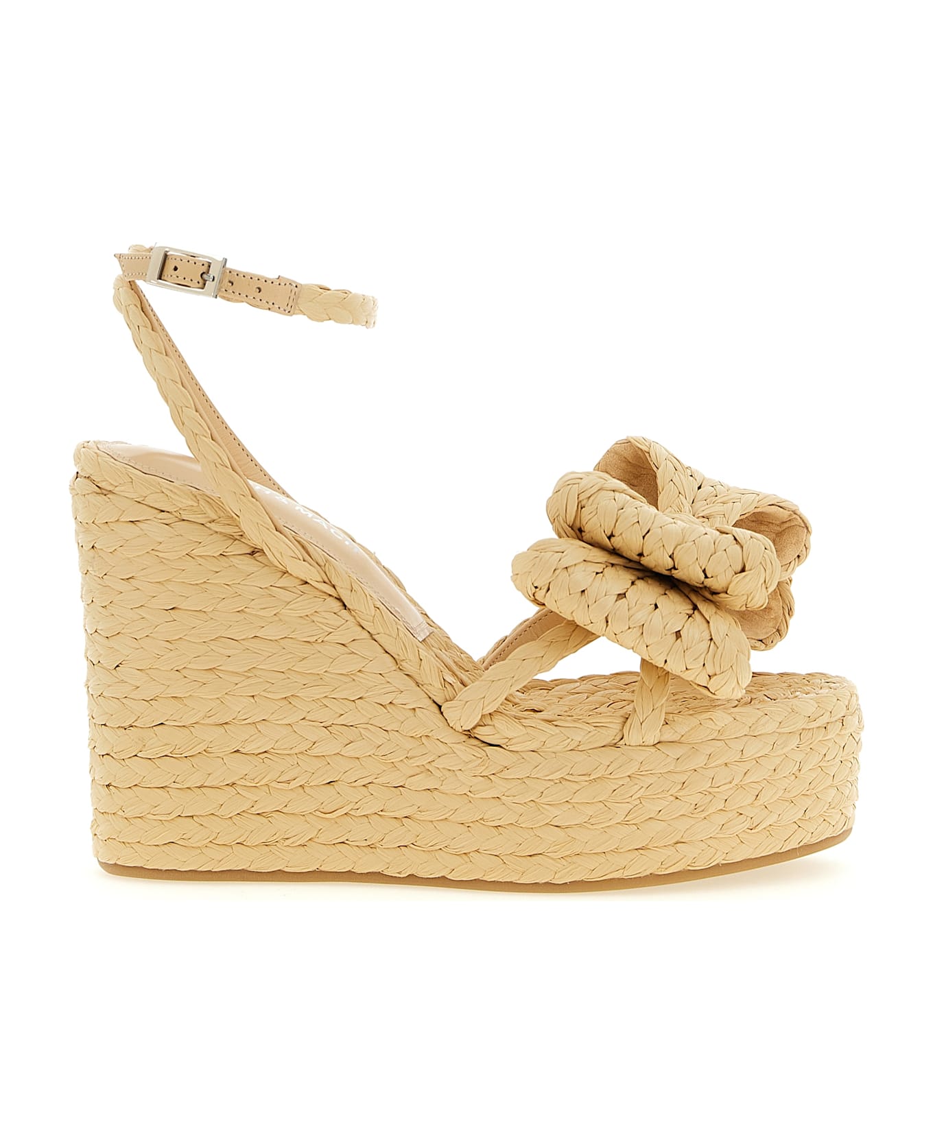 'Le Cadeau' braided raffia sandals with tone-on-tone maxi bow on the front, rounded toe, adjustable ankle strap, wedge, rubber sole. Handcrafted product, any imperfections are to be considered characteristics of uniqueness.