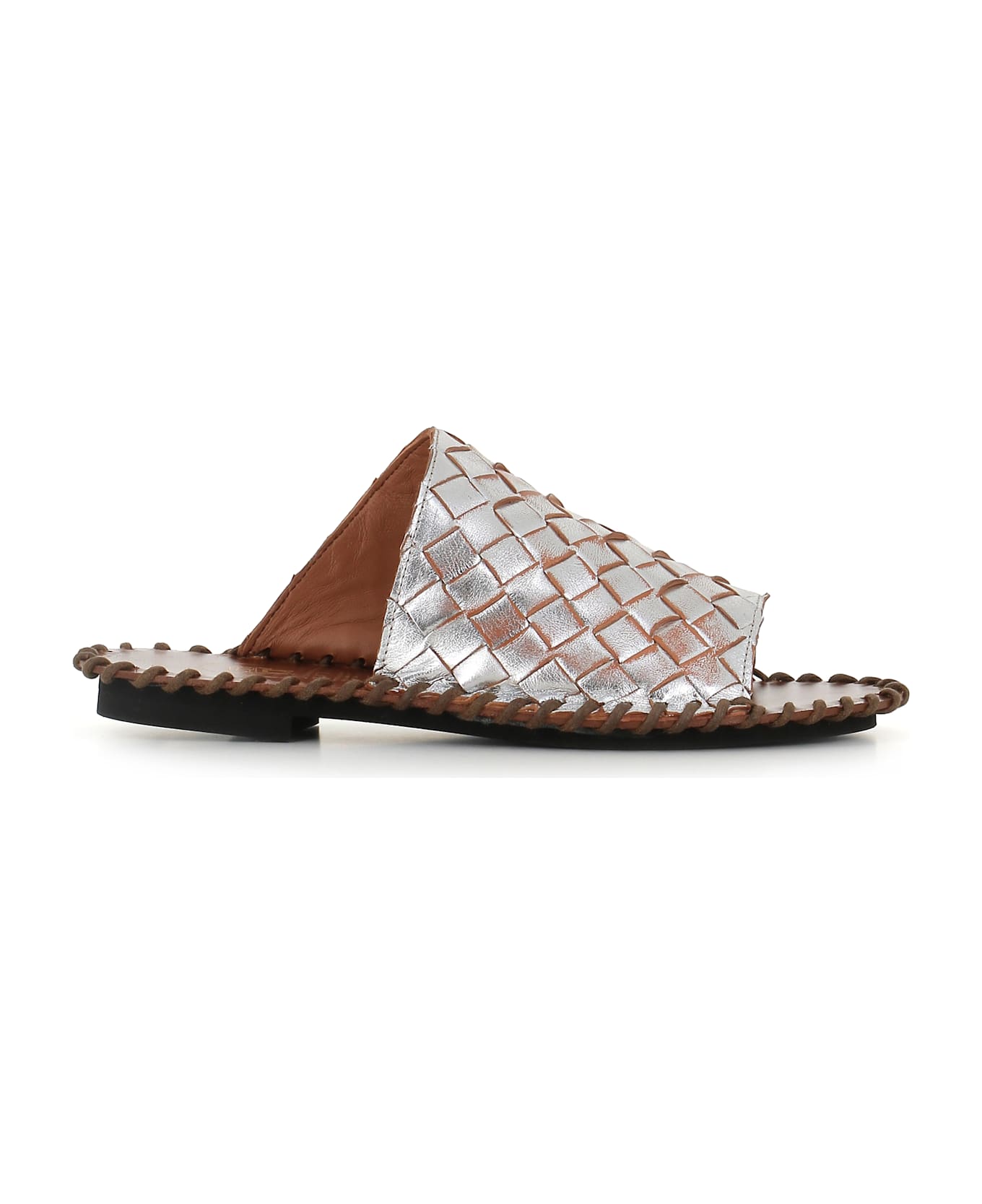 Silver soft leather women's mule by Alexander Hotto, featuring by a braided asymmetrical band. Leather fund with rubber sole. Artisan manufacturing. Heel: 2 cm