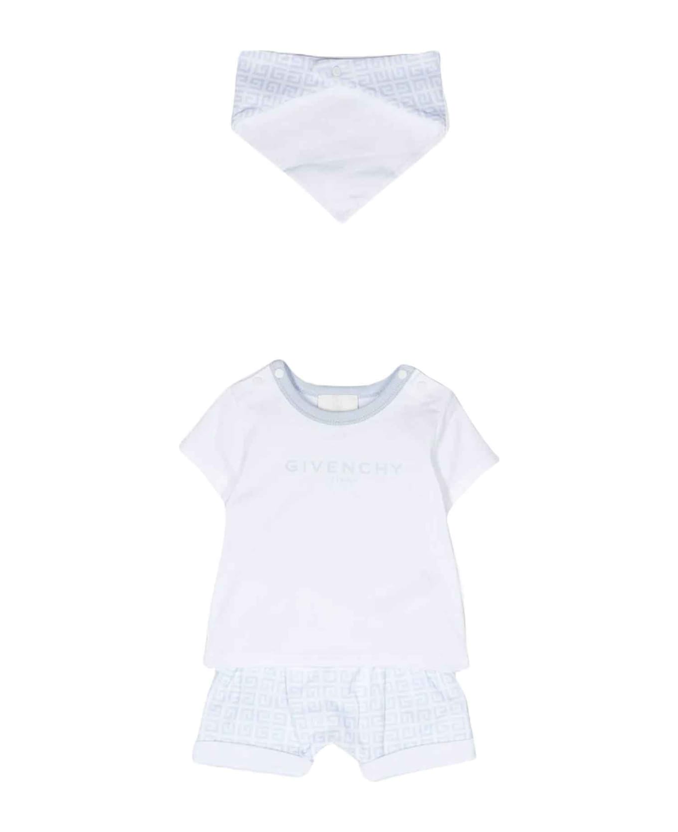 Blue set baby unisex. Logo print on front, round neckline, short sleeves, straight hem, all-over logo print, signature 4G motif, elasticated drawstring waist, two side rounded pockets, cuffed hem, all-over logo print, signature 4G motif and triangle design. 100% Cotton