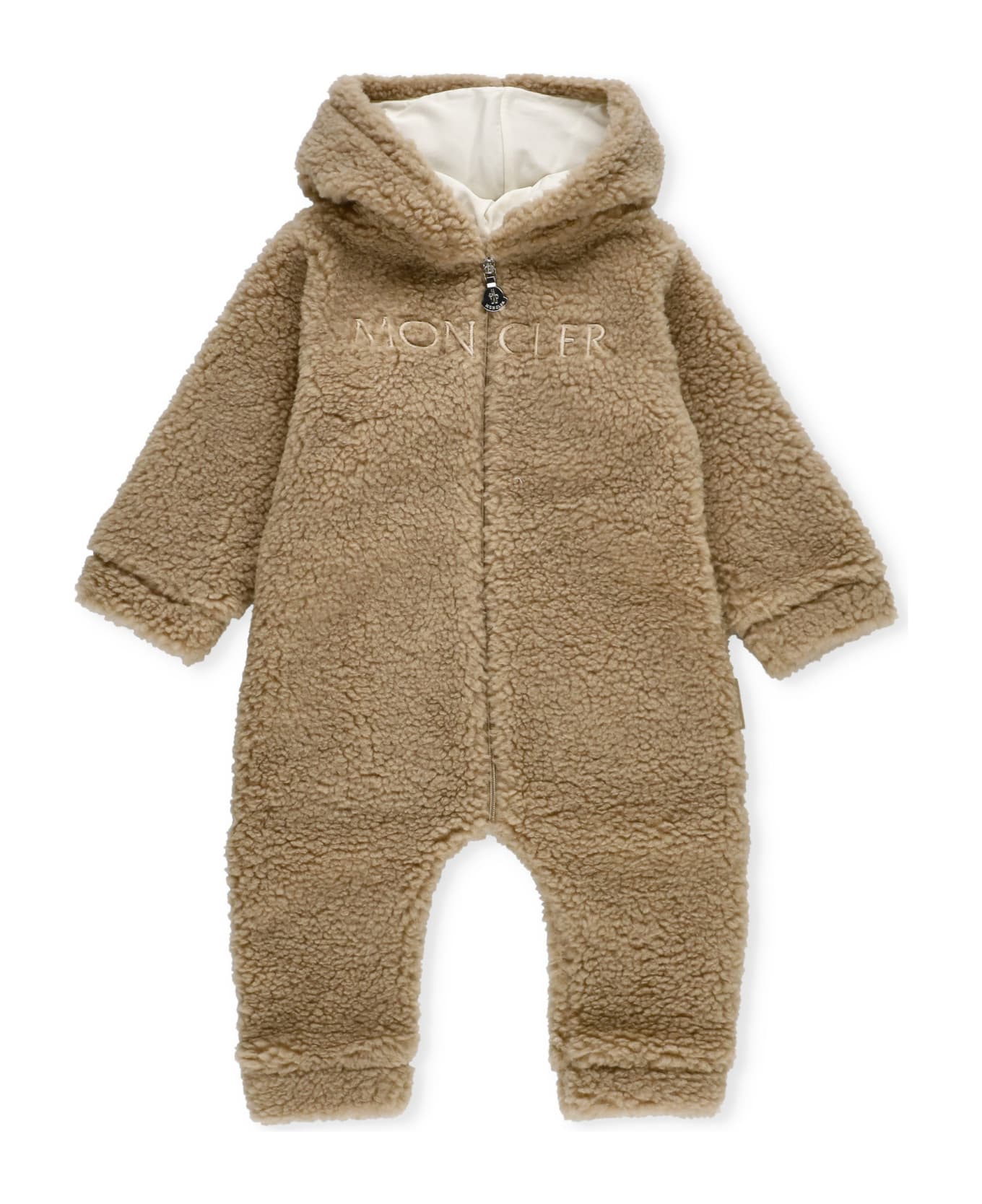 - Beige Moncler cotton teddy onesie for boy - Hood - Long sleeves - Front zip fastening - Tone on tone Moncler embroidery
