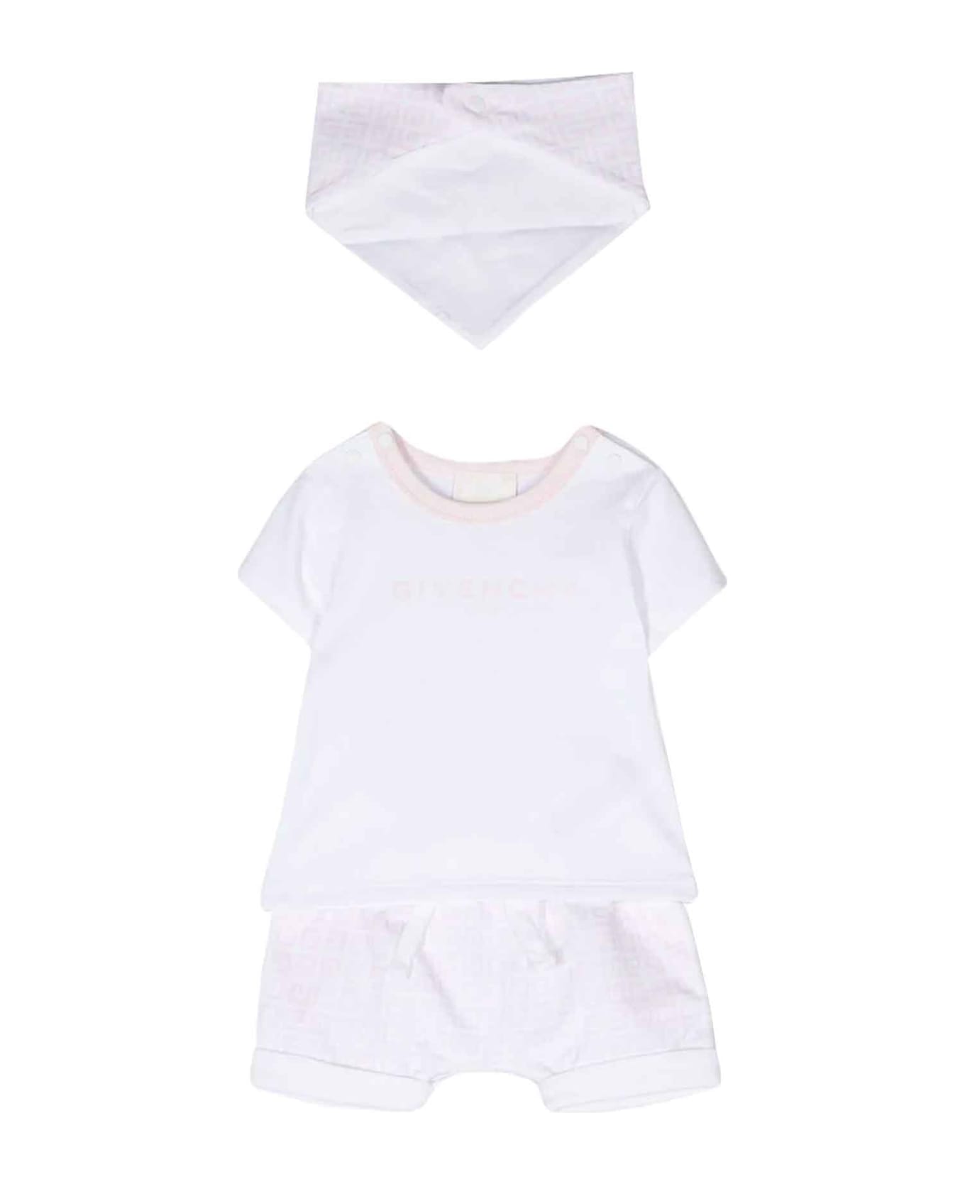 Pink set baby unisex. Logo print on front, round neckline, short sleeves, straight hem, all-over logo print, signature 4G motif, elasticated drawstring waist, two side rounded pockets, cuffed hem, all-over logo print, signature 4G motif and triangle design. 100% Cotton