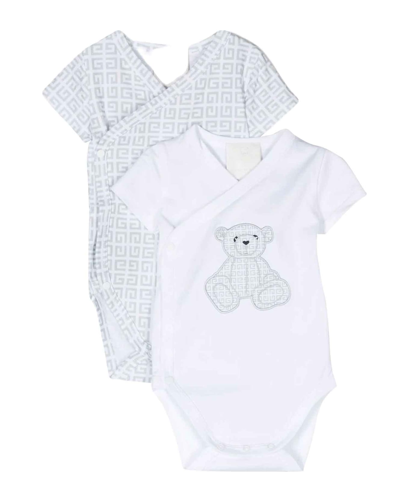 White/blue set 2 bodysuits baby unisex. Characteristic 4G pattern, teddy bear print, V-neck, short sleeves and wrap design. 100% Cotton