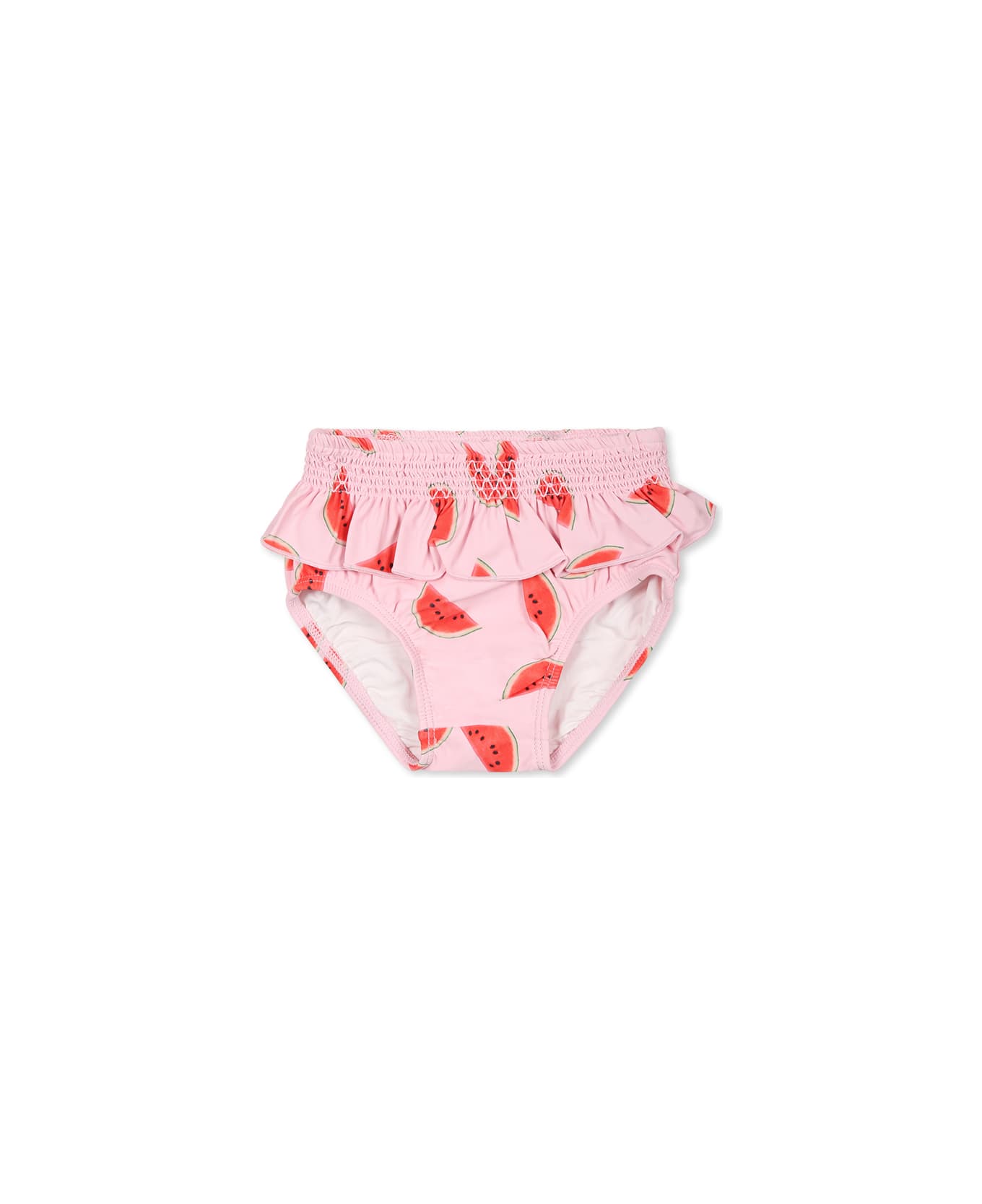 Pink swim briefs with elasticated waist and ruffles. It is embellished with an all-over watermelon print. It offers high UV protection 50+.