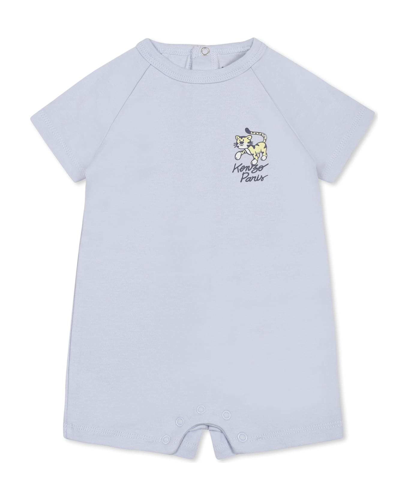 Light blue romper from the French brand Kenzo Kids, in organic cotton, with short sleeves, a crew neck, snap buttons on the back and between the legs and patch pockets on the front. It is embellished with logo and tiger on the chest.