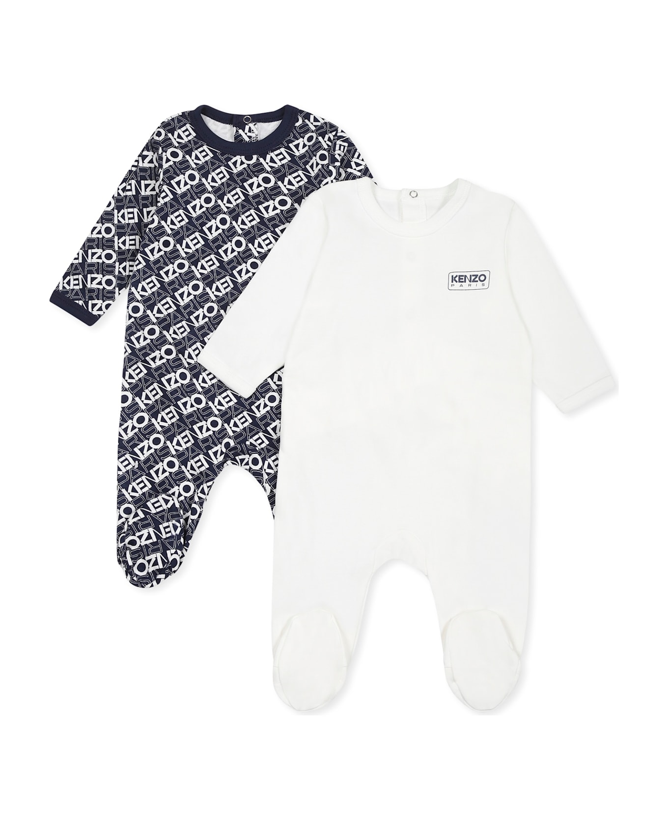Multicolor babygrow set from the French brand Kenzo Kids, in organic cotton, composed of two babygrow, white and blue. The white babygrow, with long sleeves, with a ribbed crew neck, snap buttons on the back and feet; embellished with a logo on the chest. Blue babygrow with long sleeves, with a ribbed crew neck, snap buttons on the back and feet; embellished with an all-over white logo.