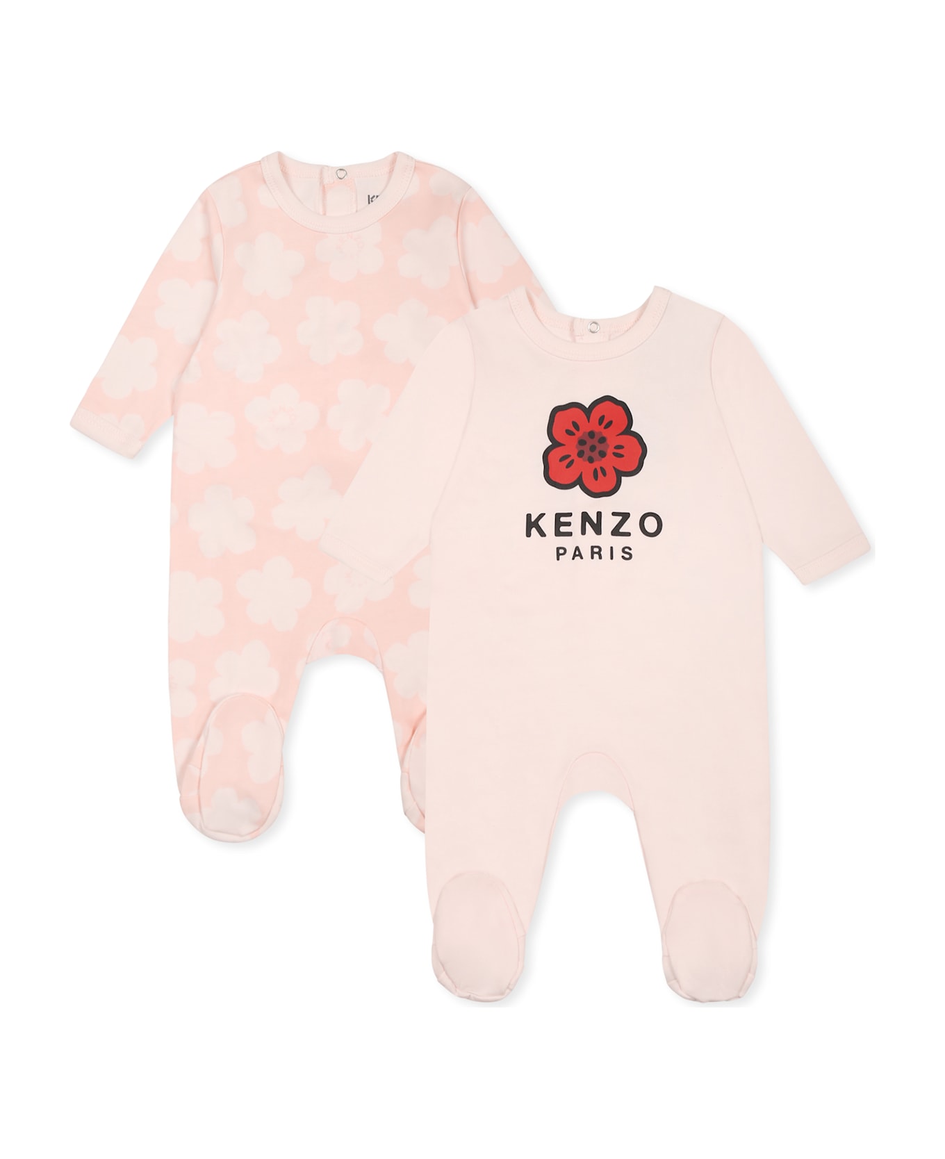 Pink rbabygrow set from the French brand Kenzo Kids, in organic cotton, composed of two babygrows, long sleeves, with ribbed crew neck, snap buttons on the back and feet. One babygrow is embellished with an all-over flower print; the other babygrow is embellished with the logo and Boke Flower, the iconic red poppy of the brand, on the front.