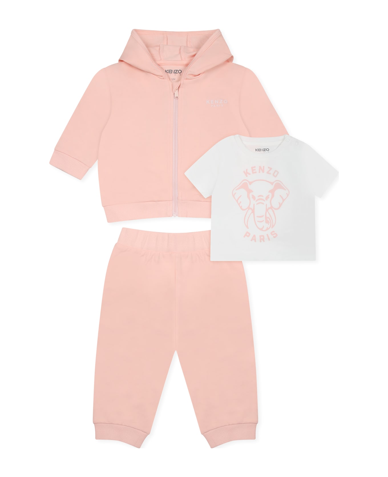 Pink suit from the French brand Kenzo Kids, in a cotton blend, cmposednsisting of a sweatshirt, t-shirt and trousers. Long-sleeved brushed sweatshirt, with hood, front zip fastening, ribbed cuffs and hem; it is embellished with logo on the chest and with elephant and logo on the back. White short-sleeved T-shirt, with a ribbed crew neck and snap button fastening on the shoulder; it is embellished with elephant and logo on the front. Brushed trousers, with an elasticated waist and ribbed ankles.