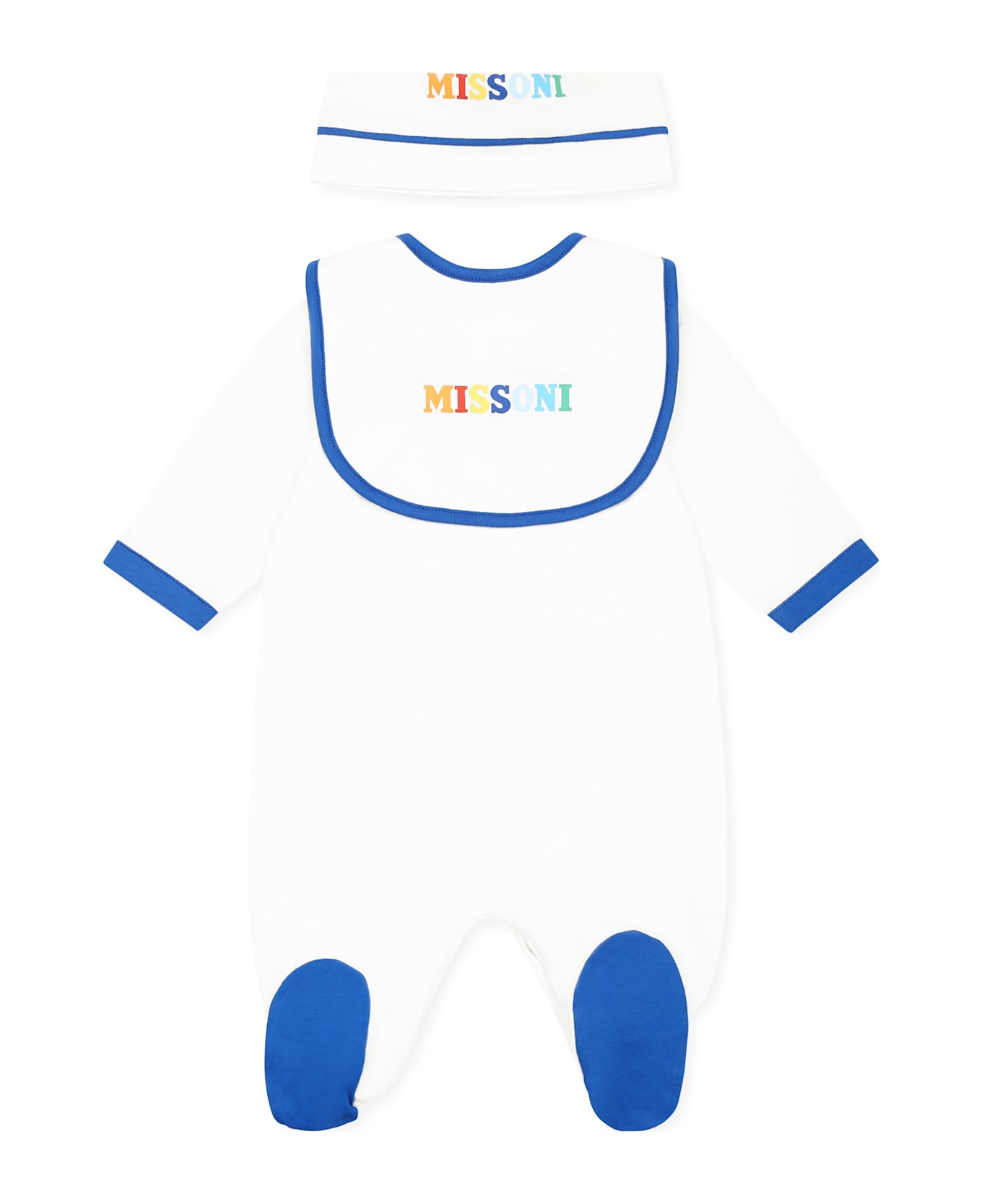 White cotton babygrow set, composed of babygrow, bib and hat. Lightweight cotton romper, with long sleeves, peter pan collar, feet, blue cuffs, snap button closure on the back and between the legs; bib with snap button on the back and blue trim; hat with blue trim. It is embellished with multicolor logo on the front.