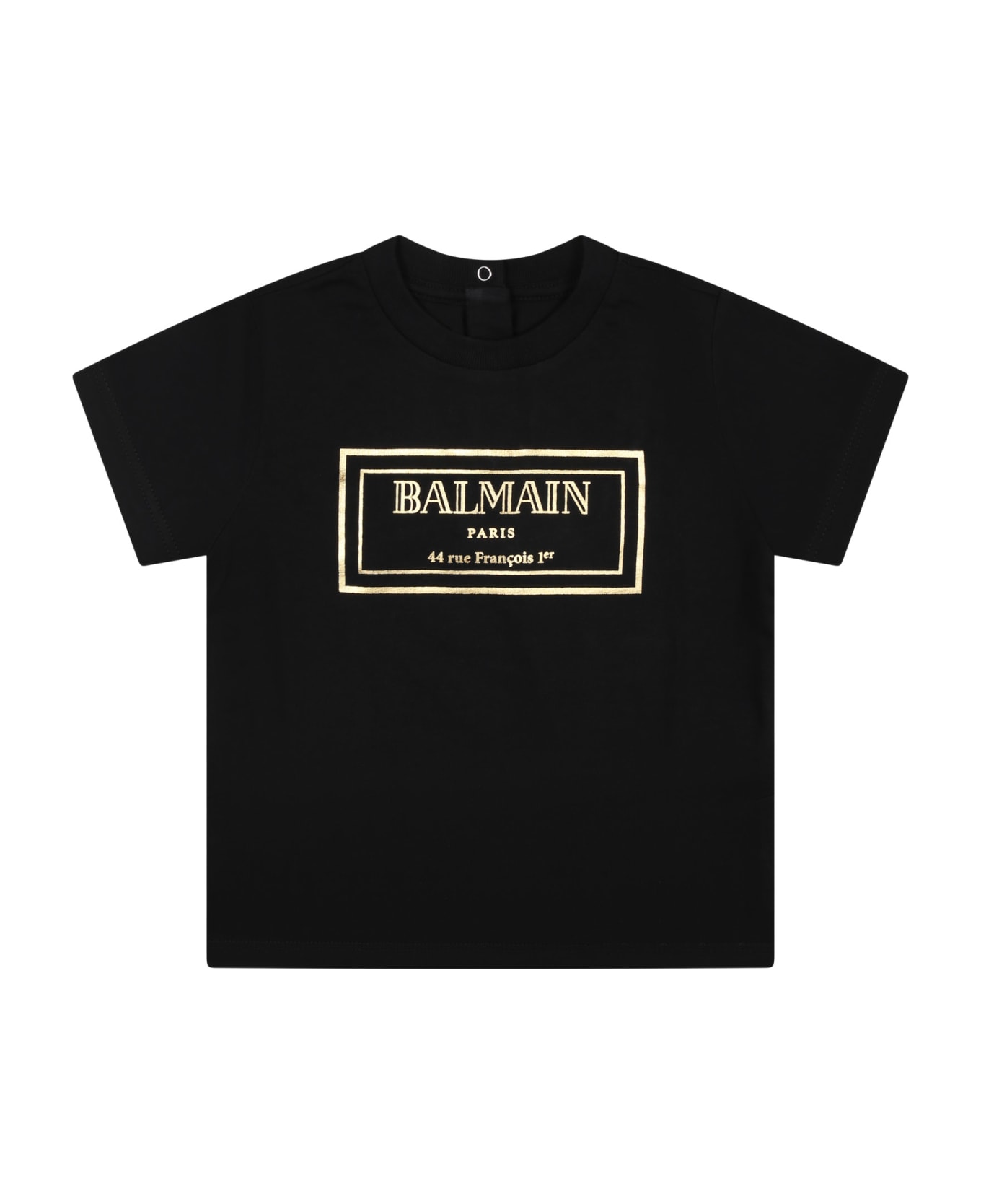 Black cotton T-shirt, with short sleeves and ribbed crew neck, snap button closure on the back. It is embellished with gold logo on the front.