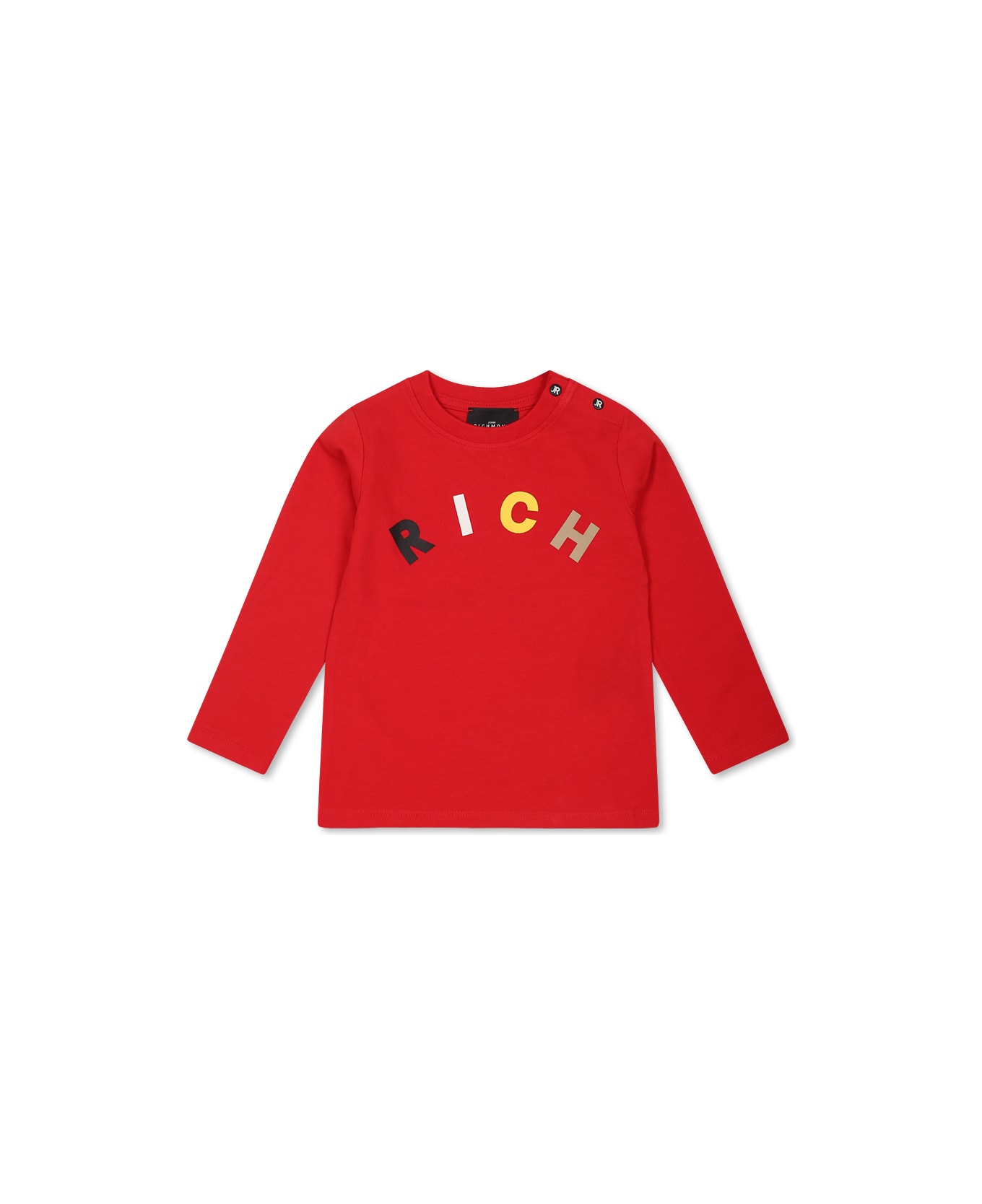 Red long-sleeved t-shirt with ribbed crew neck and snap button closure on the shoulder. It is embellished with multicolored front logo and printed logo on the back.