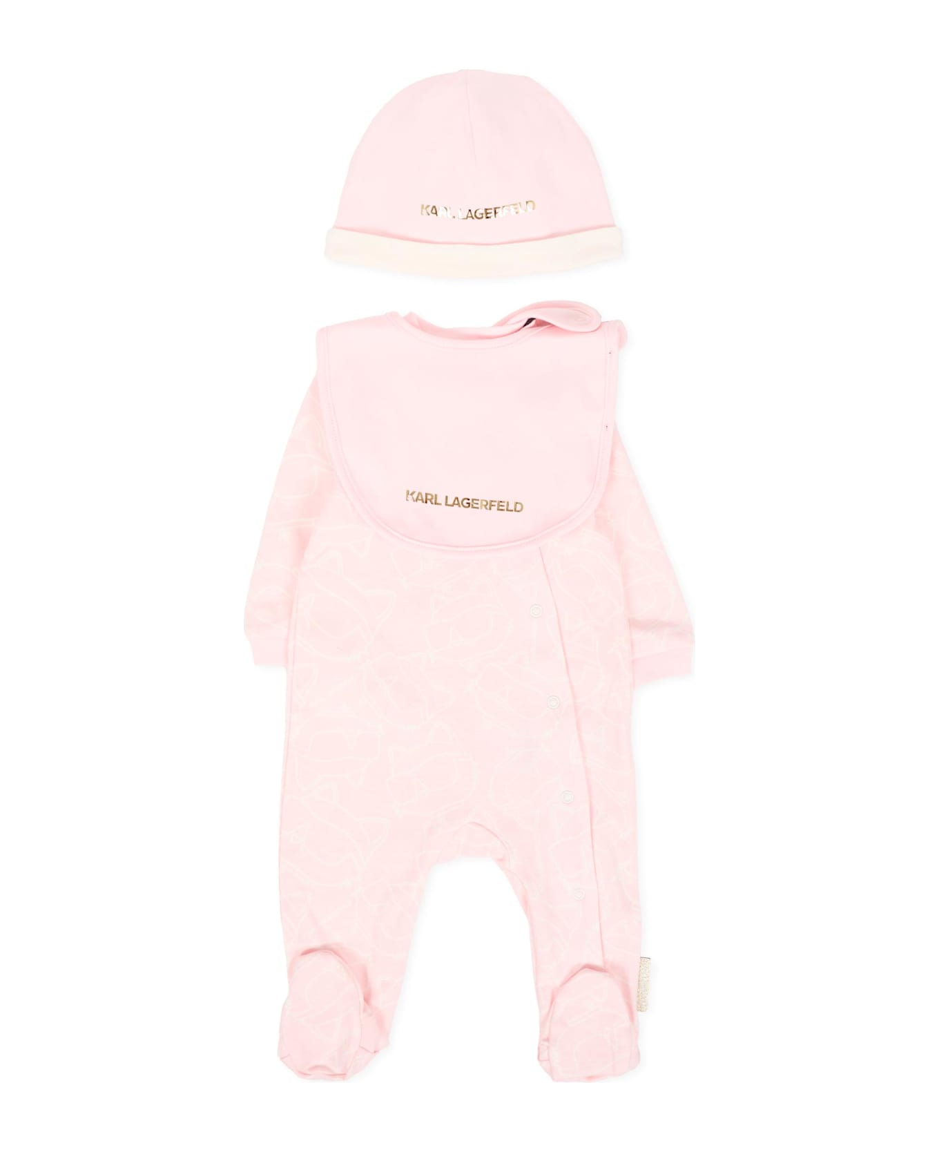 Pink cotton babygrow set, conmposed of babygrow, bib and hat. Long-sleeved babygrow, with crew neck, front fastening with snap buttons and feet; it is embellished with an all-over Choupette print. Bib with side fastening, with snap button and front logo. Hat with contrasting hem and front logo.