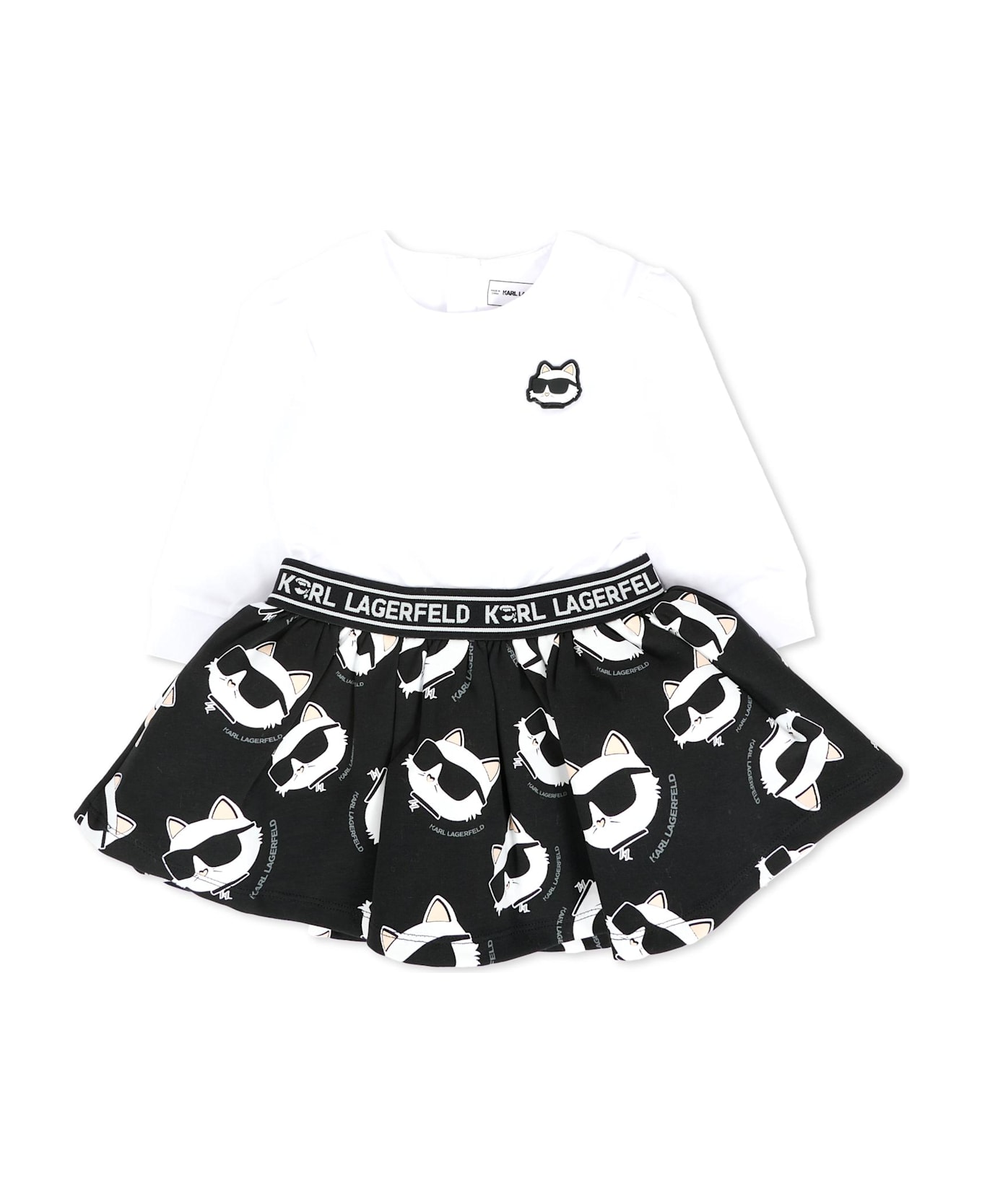 White dress with organic cotton top, long sleeves, round neckline, zip fastening on the back, logo elastic waistband and jersey skirt with all-over Choupette print. It is embellished with Choupette-shaped patches on the chest.