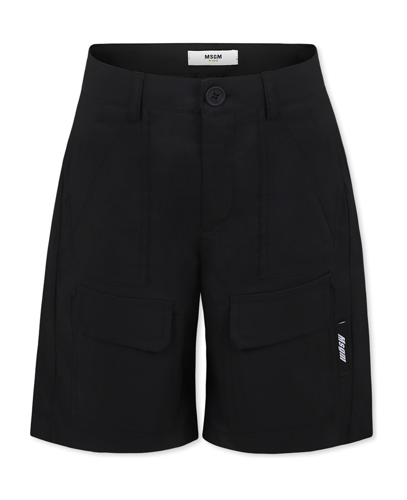 Black shorts with belt loops, front zip and button fastening, adjustable waist thanks to internal elastic with buttons, side pockets, back pockets and flap pockets on the front. They are embellished with a logo patch on the front.