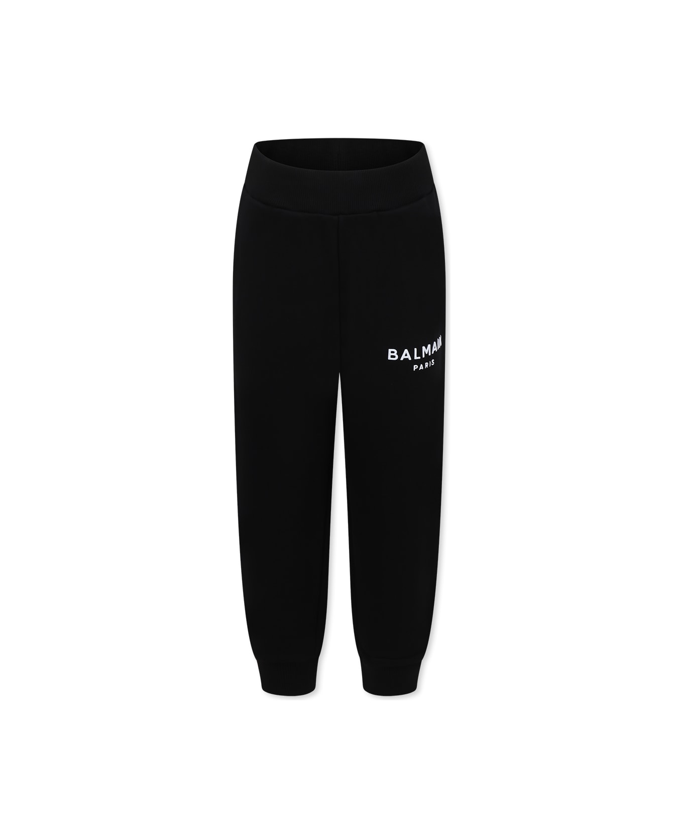 Black trousers in brushed organic cotton, with elasticated waist, side pockets and ribbed ankles. They are embellished with a white Balmain logo embossed on one leg.