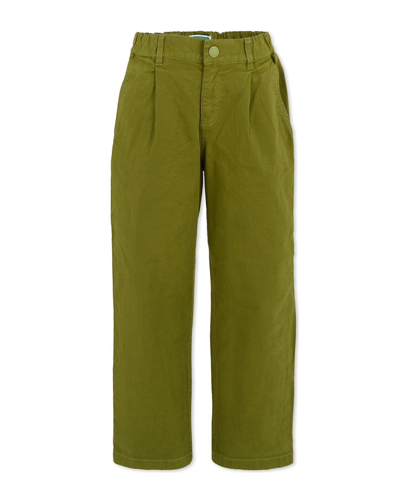 Green cotton twill trousers with an elasticated waist, a snap button and zip front fastening, side pockets, and patch pockets on the back. They are embellished with an embroidered logo on the back.
