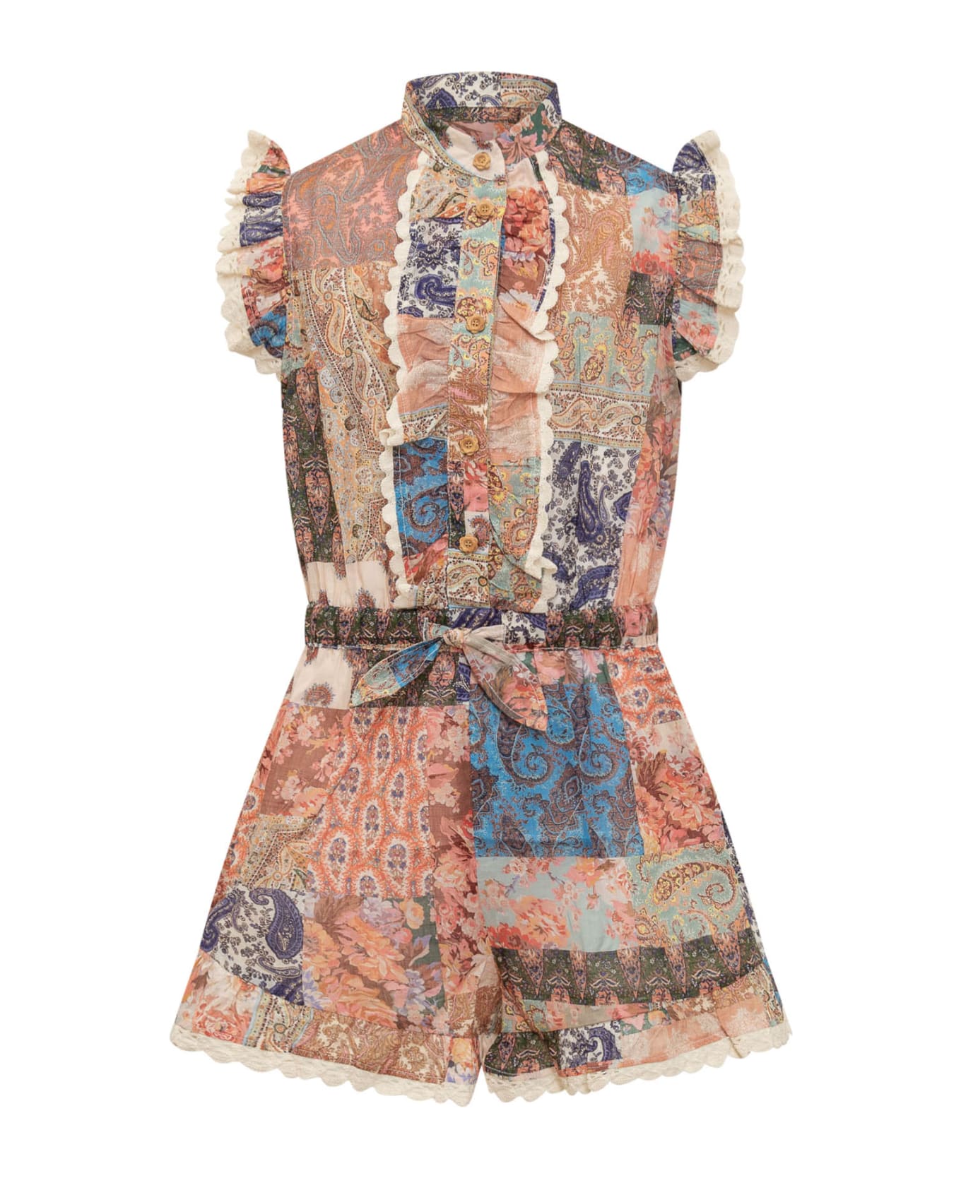 Short suit. Short sleeves. Front button closure. Waist belt. Hems with lace. Bandana print.