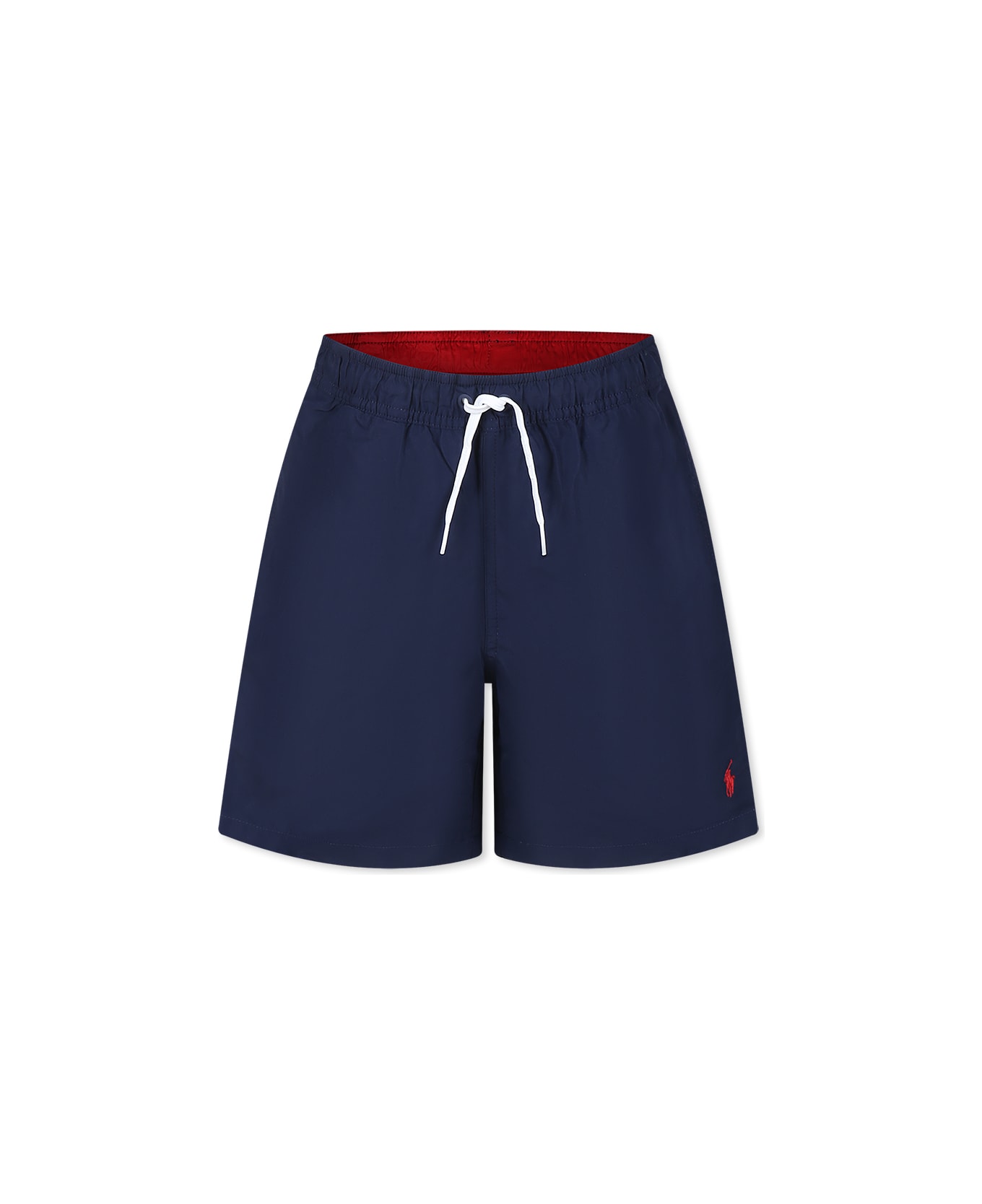 Blue swim shorts with elasticated waist, drawstring, side pockets and flap pocket on the back; made of recycled polyester. It is embellished with iconic red horse embroidered on the front.