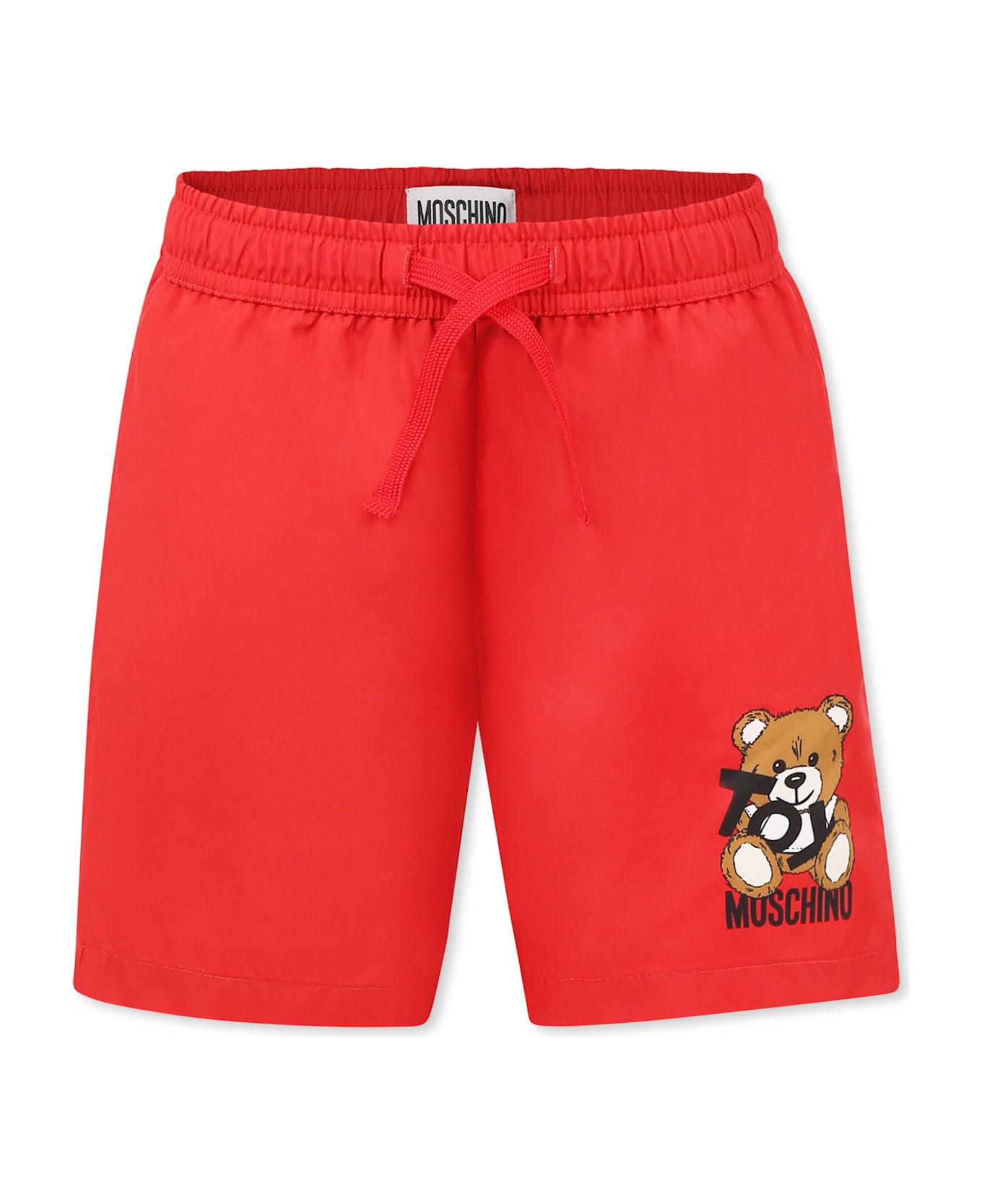 Moschino Kids red swim shorts with elastic waist, drawstring and side pockets. It is embellished with Teddy Bear, Toy writing and logo on one leg.