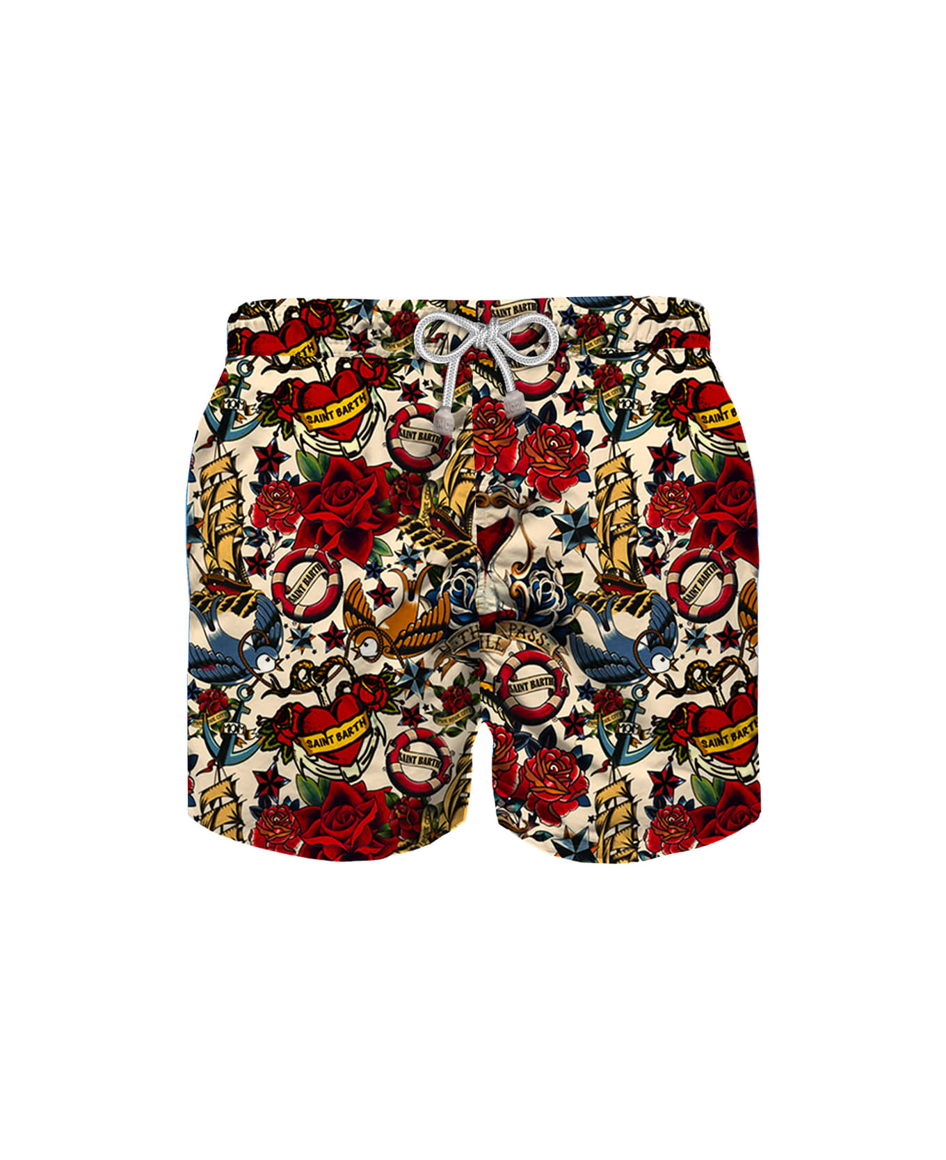 Boys' Swim Trunks, mid lenght, tattoo fantasy all over print, regular fit, microfiber fabric, comfortable drawstring waist, inside ergonomic brief, drawcord closure, pockets on both sides, backside classic pocket with velcro closure. Model Jean Vivienne.