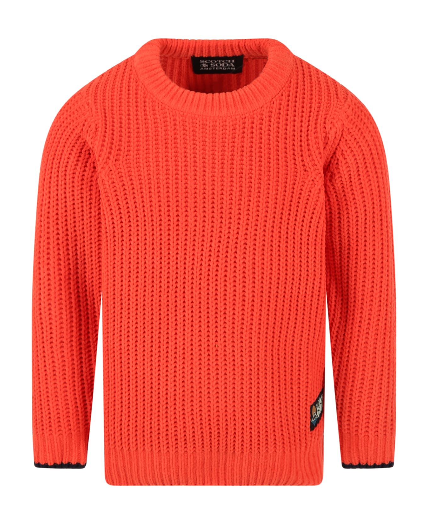 Orange sweater with long sleeves, ribbed crew neck and cuffs. It is embellished with black logo patch on the front.