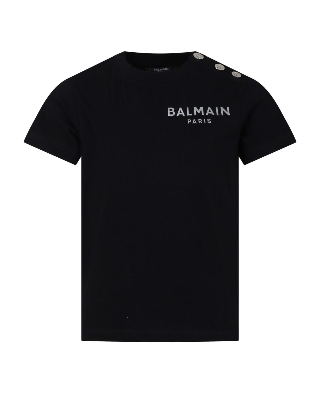 Black cotton T-shirt, with short sleeves and ribbed crew neck. It is embellished with silver buttons on the shoulder and white logo on the front.