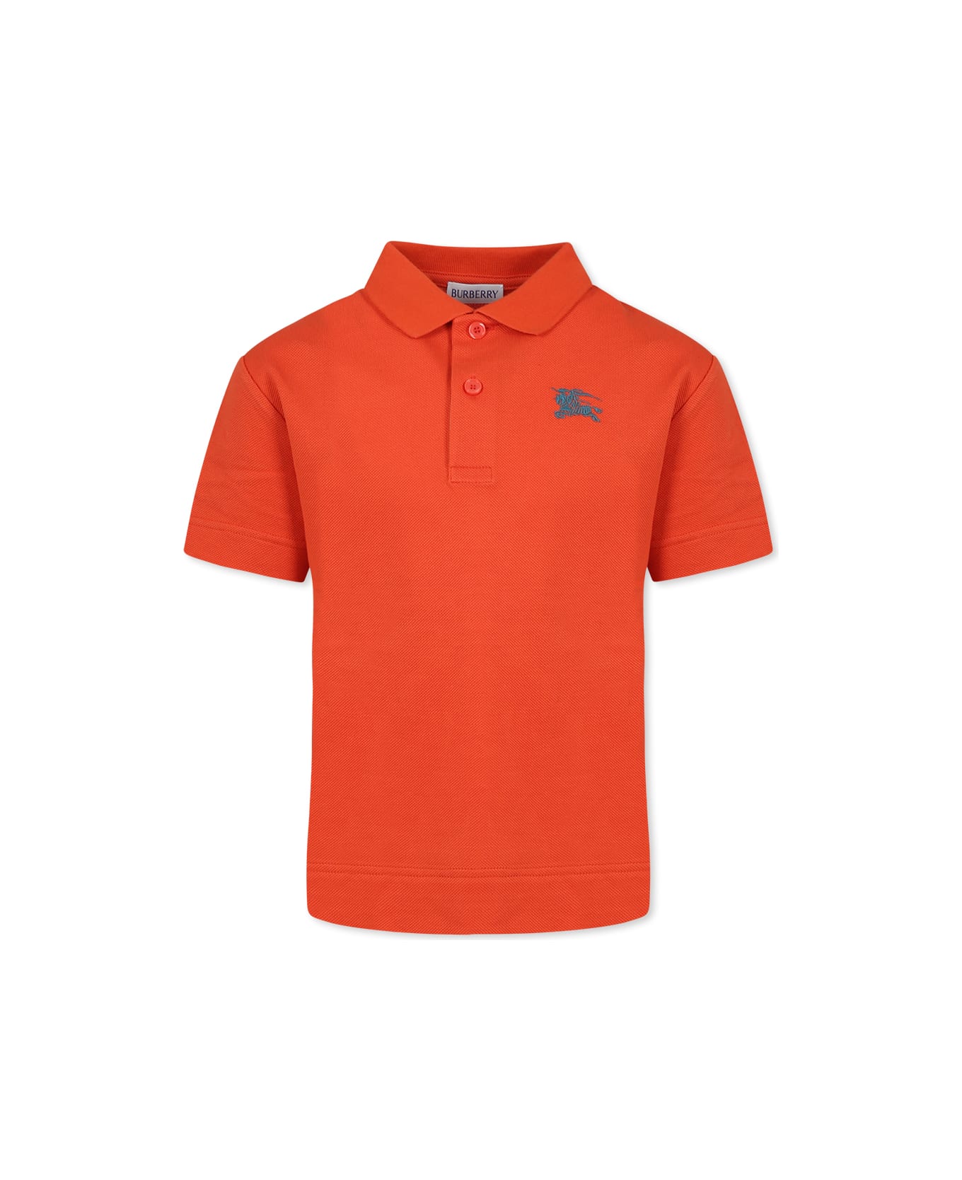 Orange polo shirt from the luxury brand Burberry made of cotton, with short sleeves, collar and button closure on the front. It is embellished with an iconic green logo embroidered on the chest.
