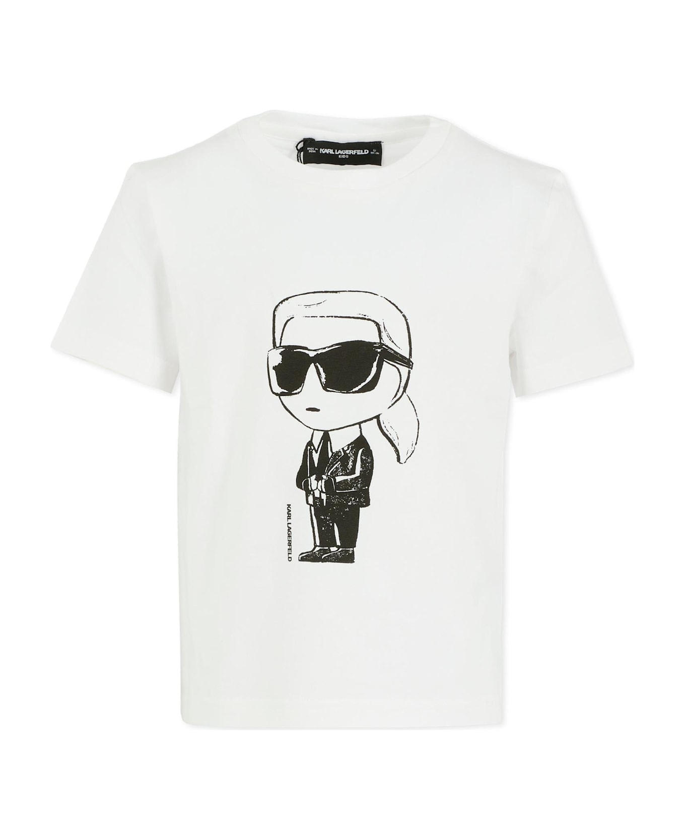White organic cotton t-shirt, with short sleeves and ribbed crew neck. It is embellished with a Karl Lagerfeld print on the front and a logo on the back.
