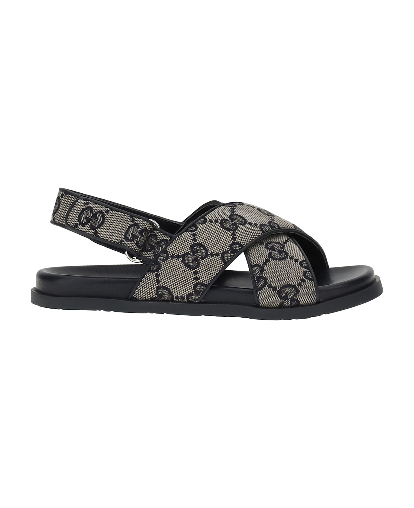 Gucci's kid's sandals are a practical and stylish style featuring the iconic all-over printed gg logo. the rubber sole offers comfort and durability, while the adjustable pull-on closure at the back ensures an easy and secure fit. the branded insole adds a recognizable touch to the design, making these sandals a perfect blend of style and functionality for little ones.