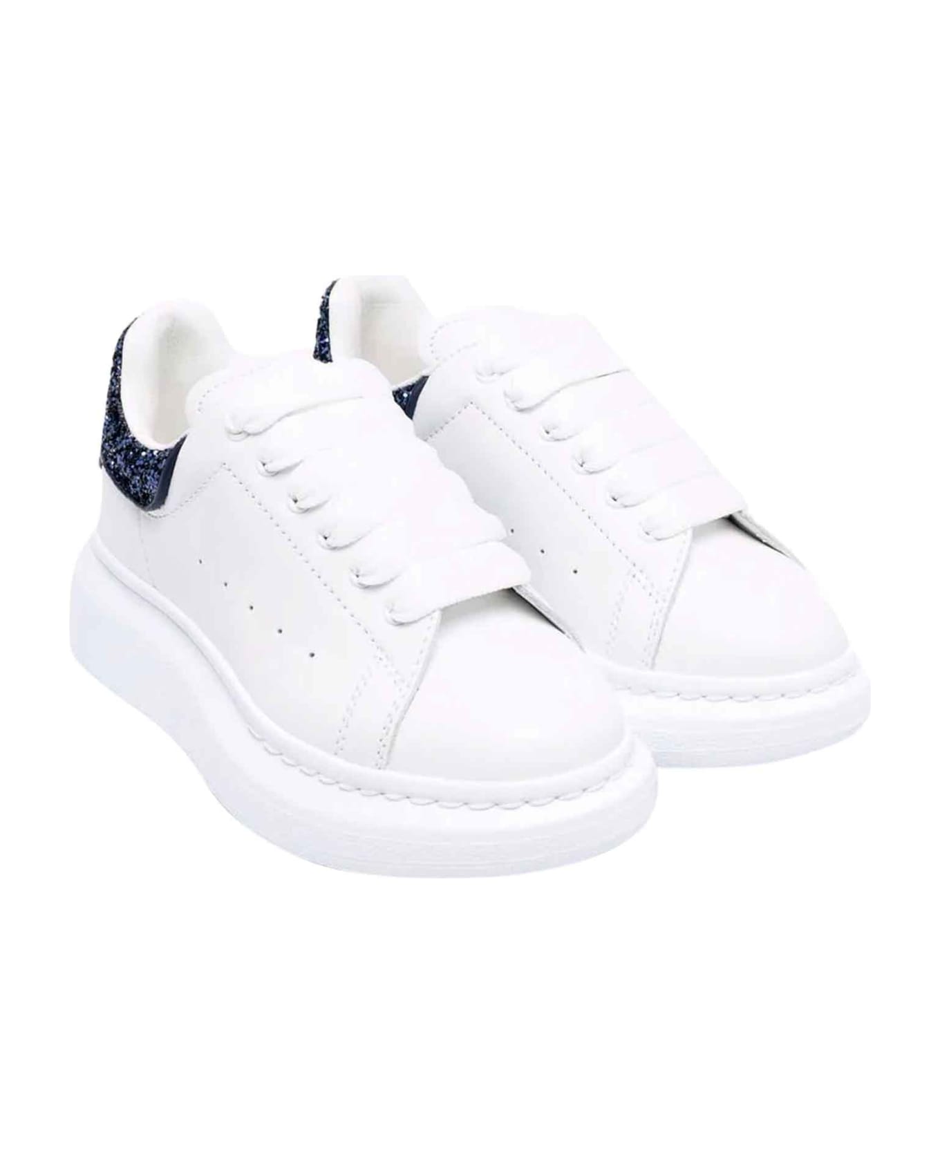 kids unisex white oversized sneakers with blue detail on the heel with logo. Closure with laces and chunky sole. 100% leather