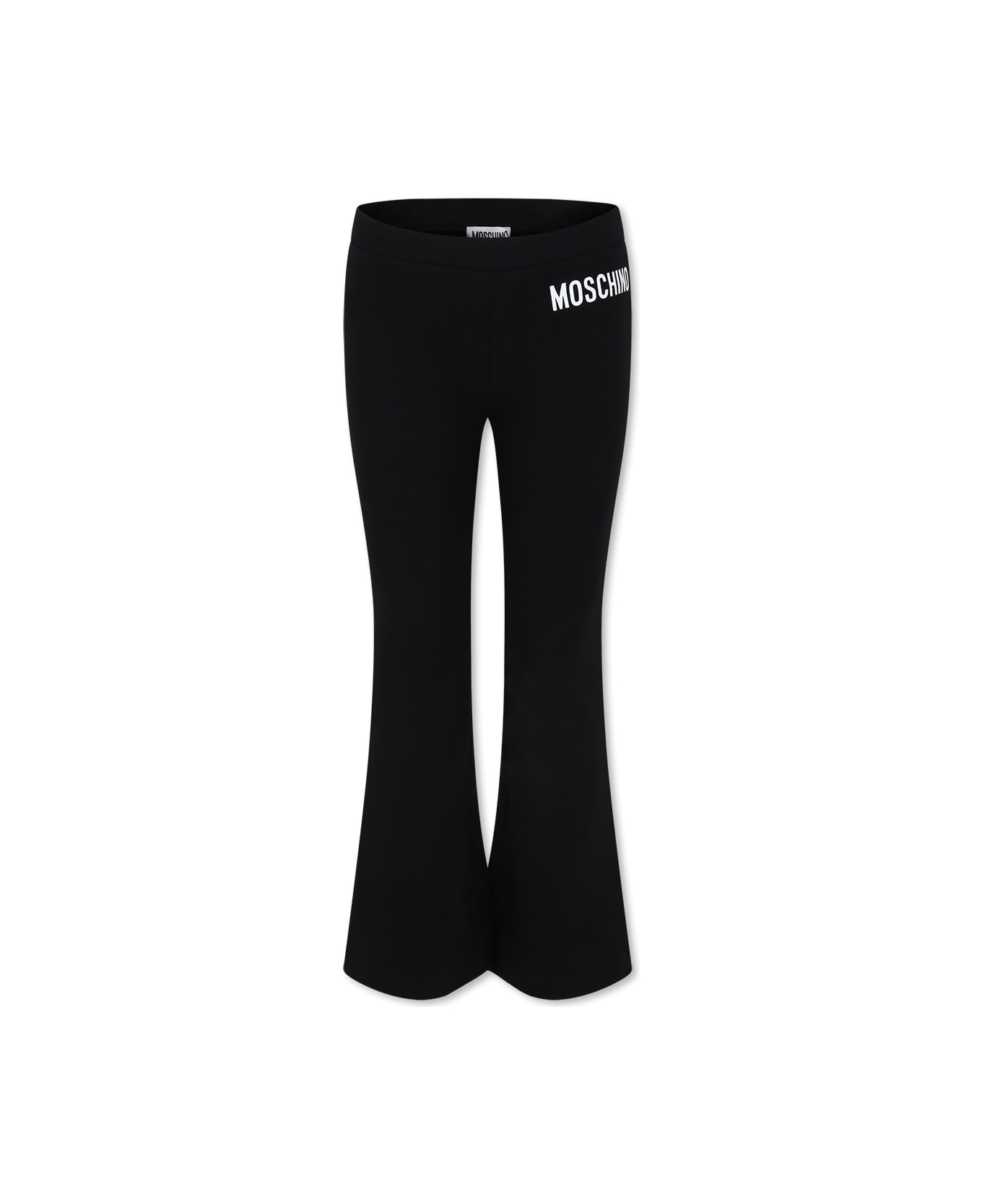 Flared black leggings from the Moschino KIds brand, with elasticated waist. They are embellished with a side logo.