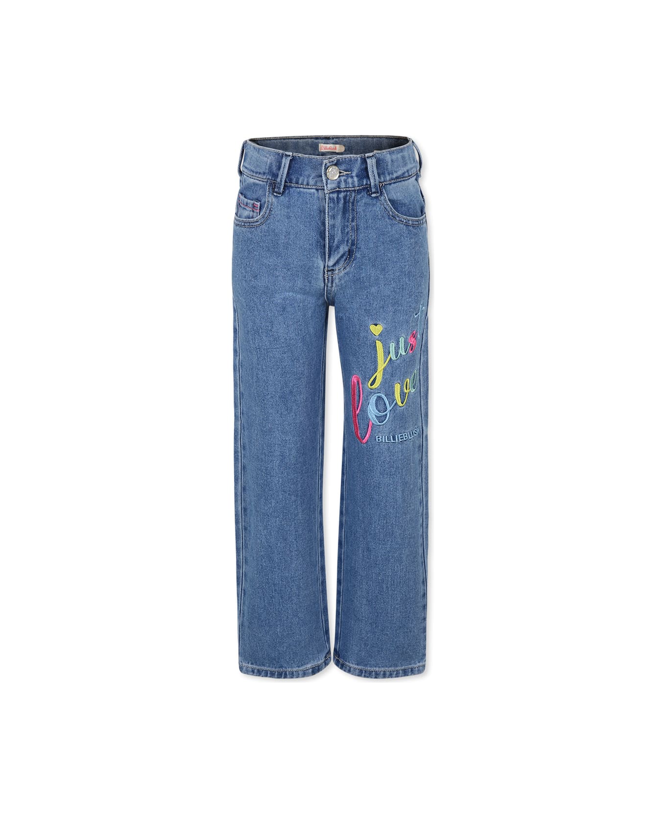 Blue denim jeans in cotton, five pockets, belt loops, front zip and drawstring fastening, adjustable waist thanks to internal elastic with buttons. They are embellished with embroidered writing and logo on the front.