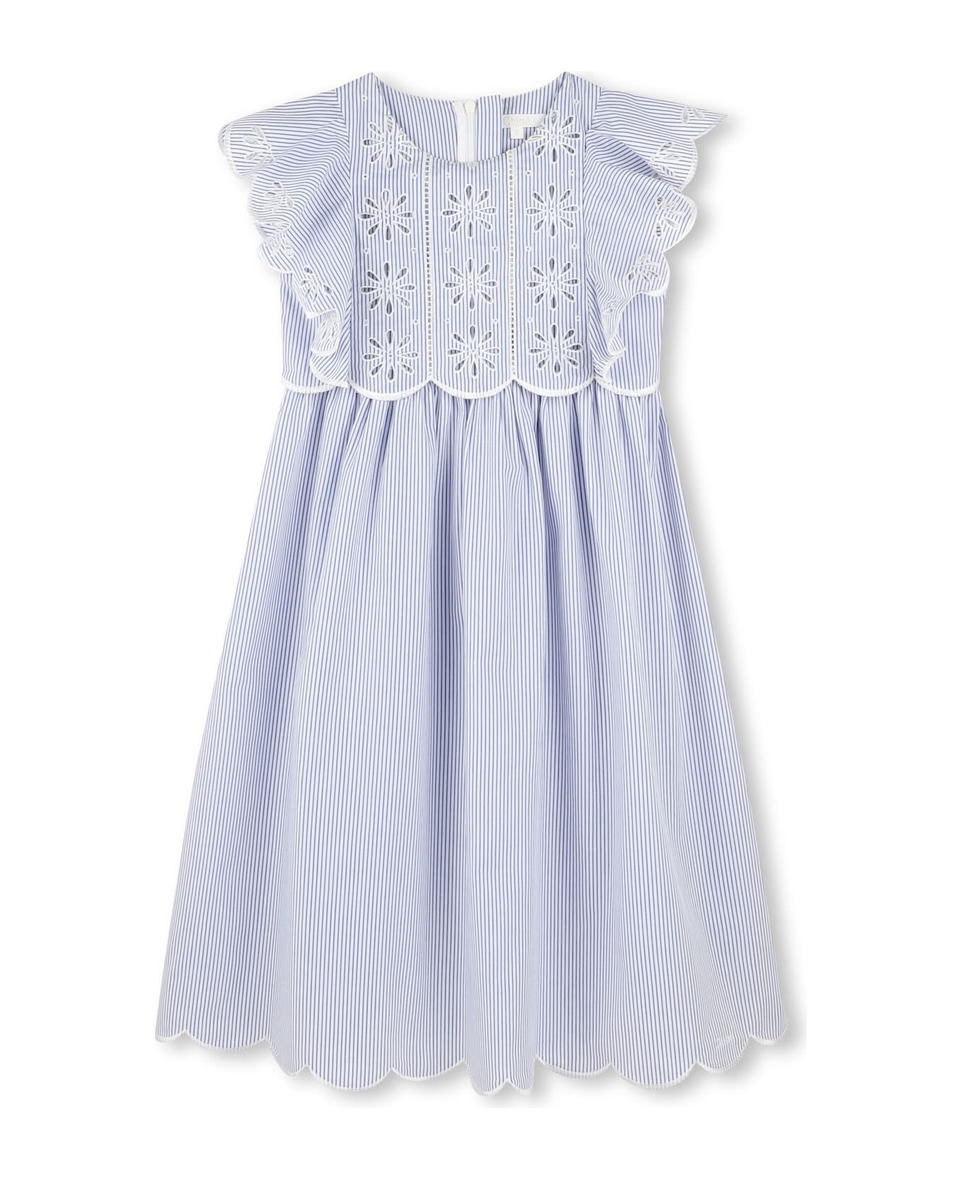 Abito a righe celeste/bianco cotone biologico trama popeline chiusura posteriore con zip nascosta motivo a righe verticali scollo rotondo maniche volant decorazione con punto inglese dettaglio con arricciature gonna svasata logo ricamato sull'orlo orlo a smerlo