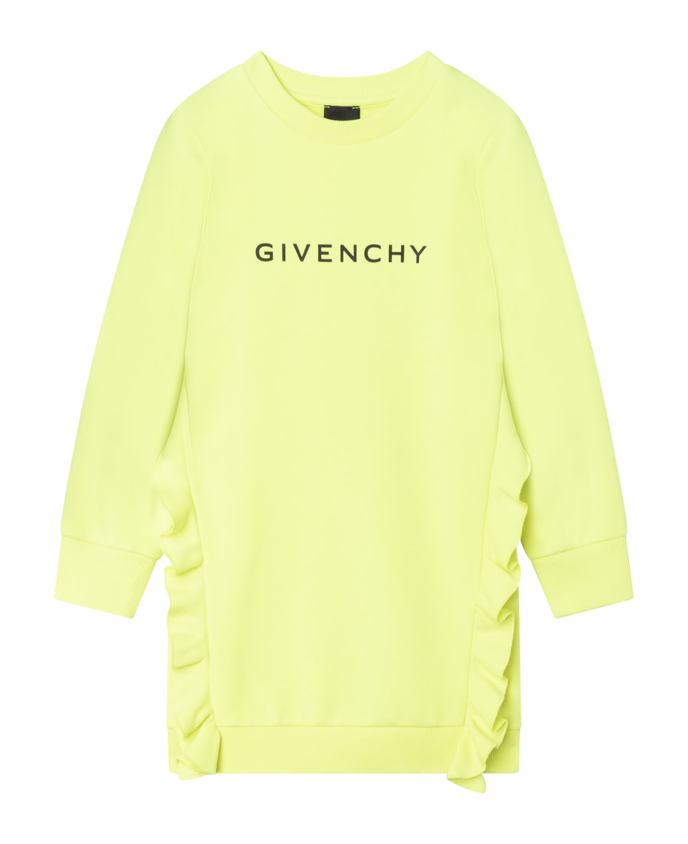 logo-print sweatshirt dress from Givenchy Kids featuring neon green, cotton blend, signature 4G motif, logo print to the front, gathered detailing, round neck, long sleeves and straight hem.
