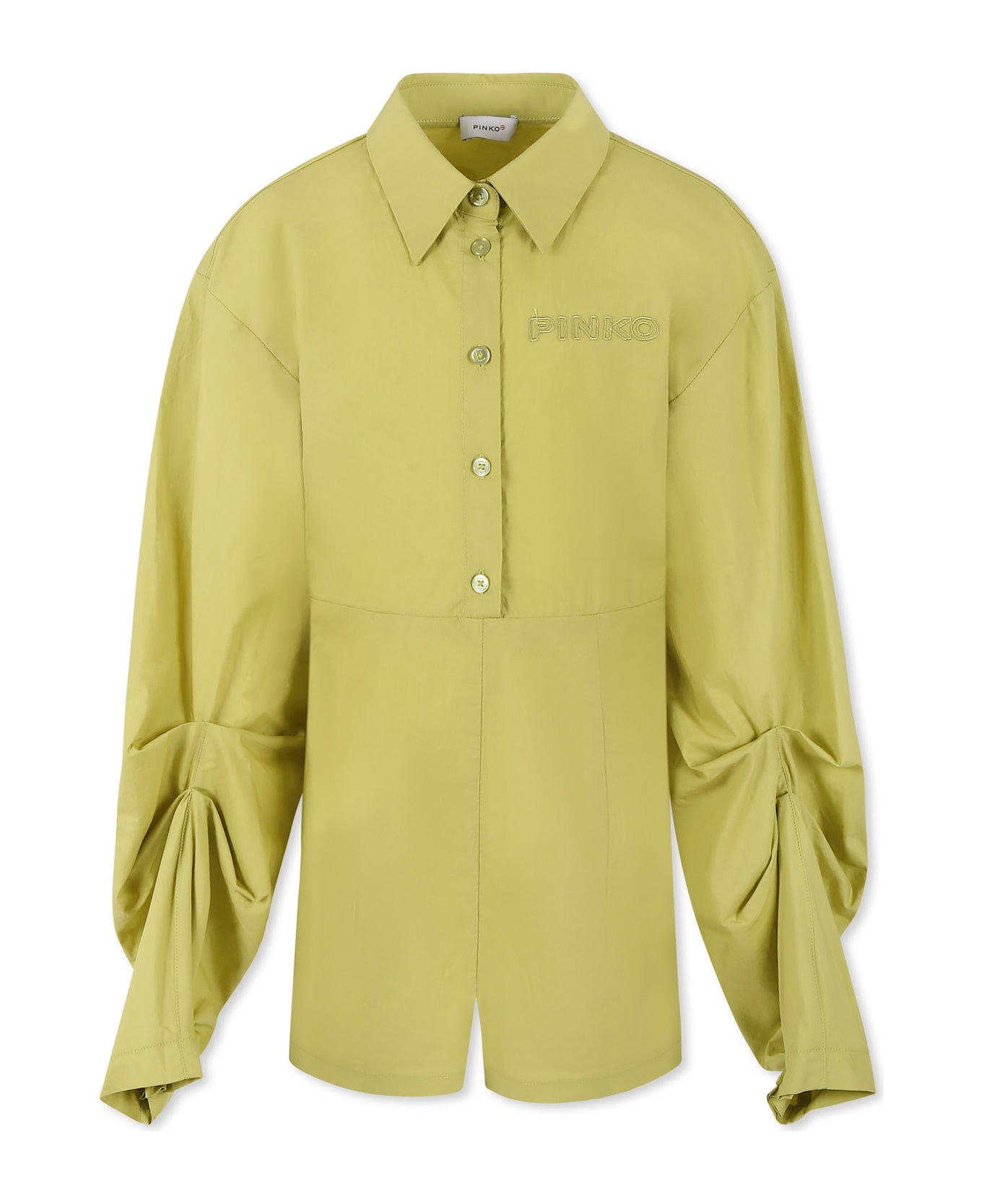 Green jumpsuit in cotton poplin, with long gathered sleeves, pointed collar, front fastening with buttons, zip and cut out detail, on the back. It is embellished with logo embroidered on the chest.