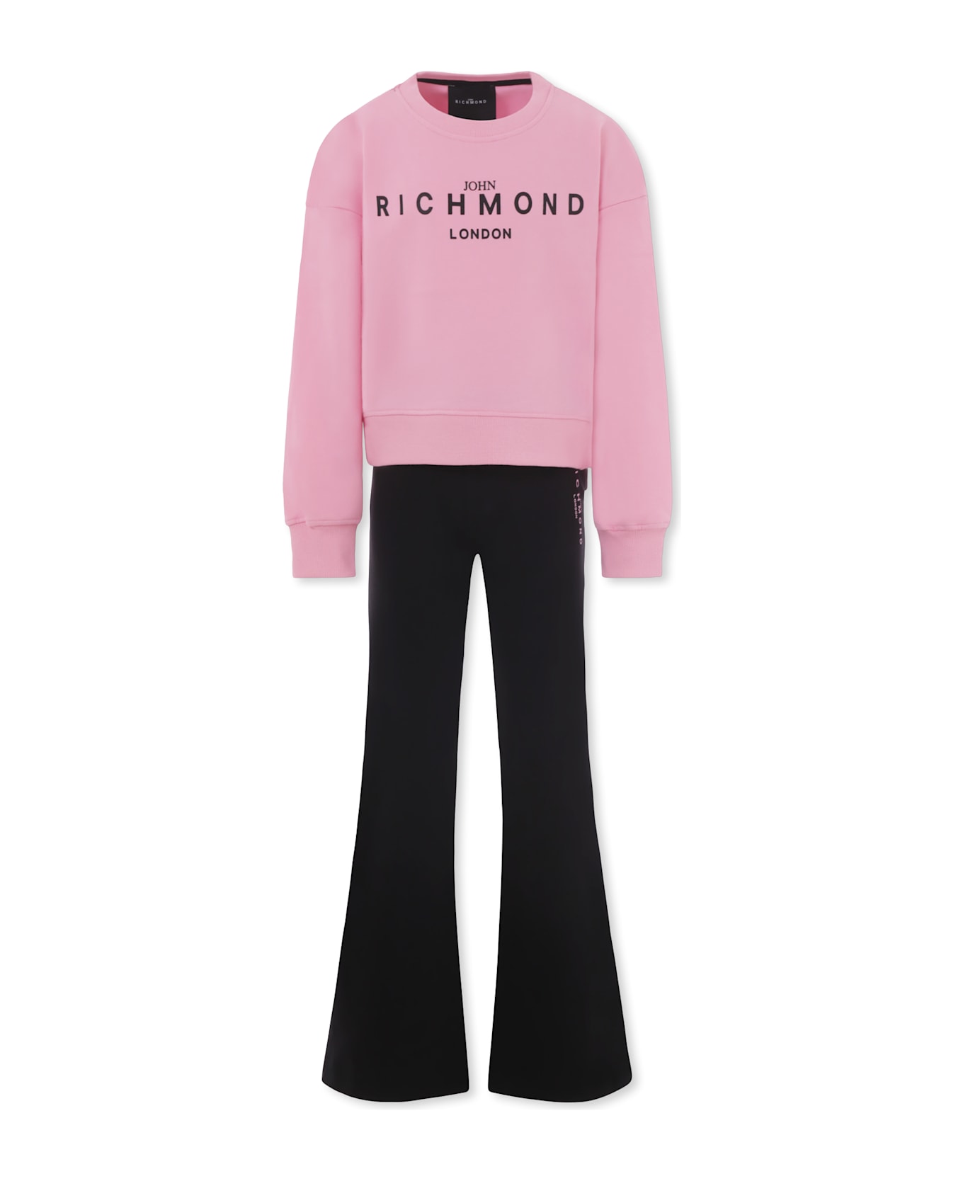 Pink suit composed of sweatshirt and trousers. Long-sleeved brushed cotton crop sweatshirt with crew neck, ribbed cuffs and hem and side slits; black flared trousers with elasticated waist. It is embellished with logo on the front and side logoed patch.