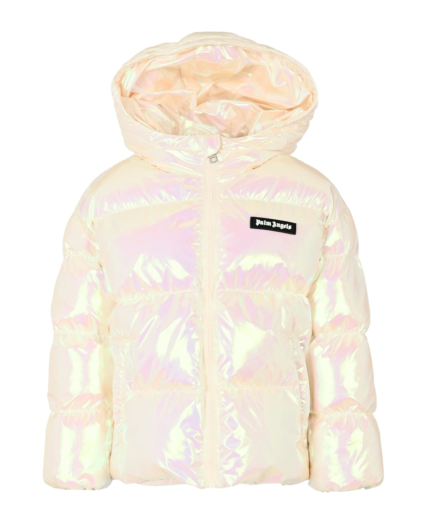 Iridescent pink padded and quilted down jacket, with long sleeves, hood, front zip fastening, side pockets and elasticated cuffs. It is embellished with a rubber logo patch on the chest.