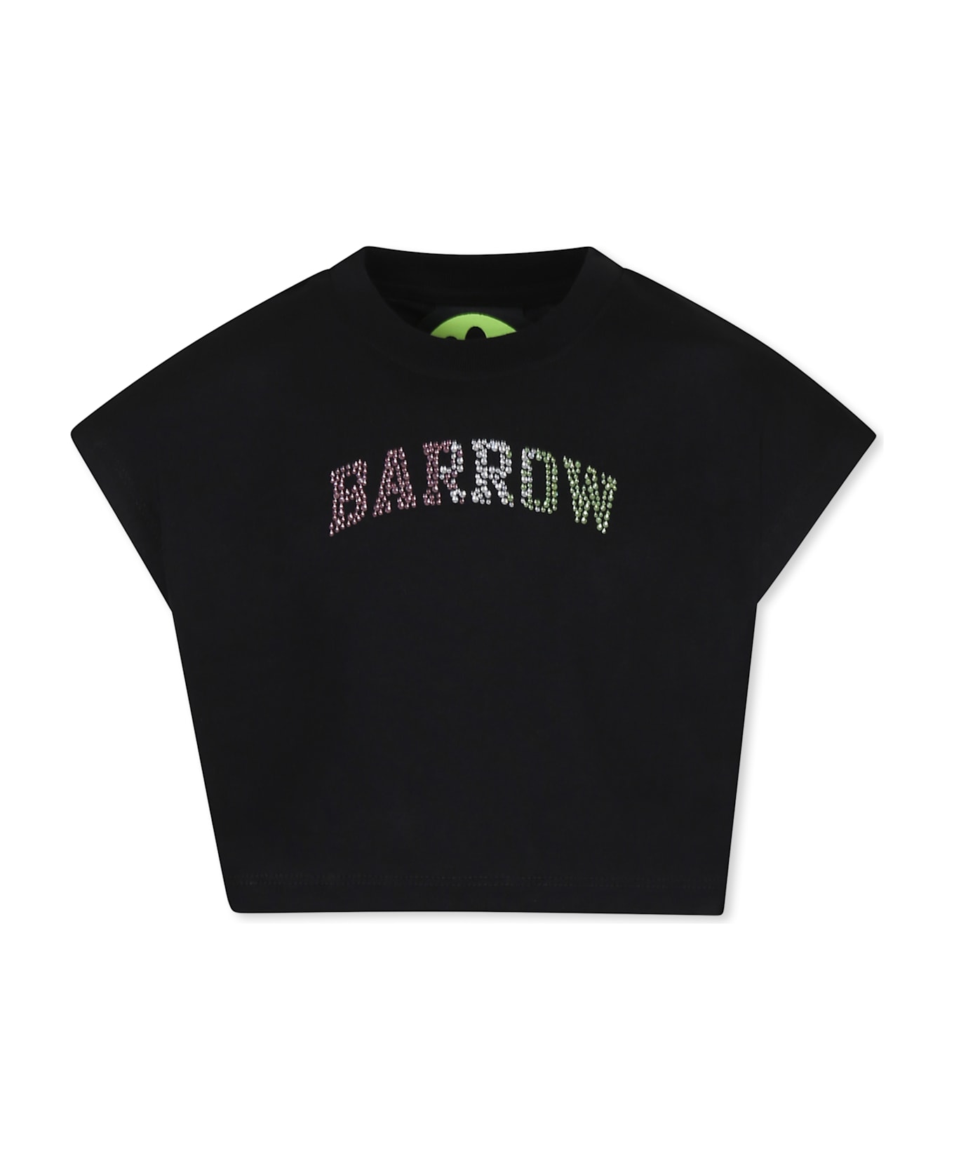 Black cotton crop t-shirt, with short sleeves and ribbed crew neck. It is embellished with rhinestone logo on the front.