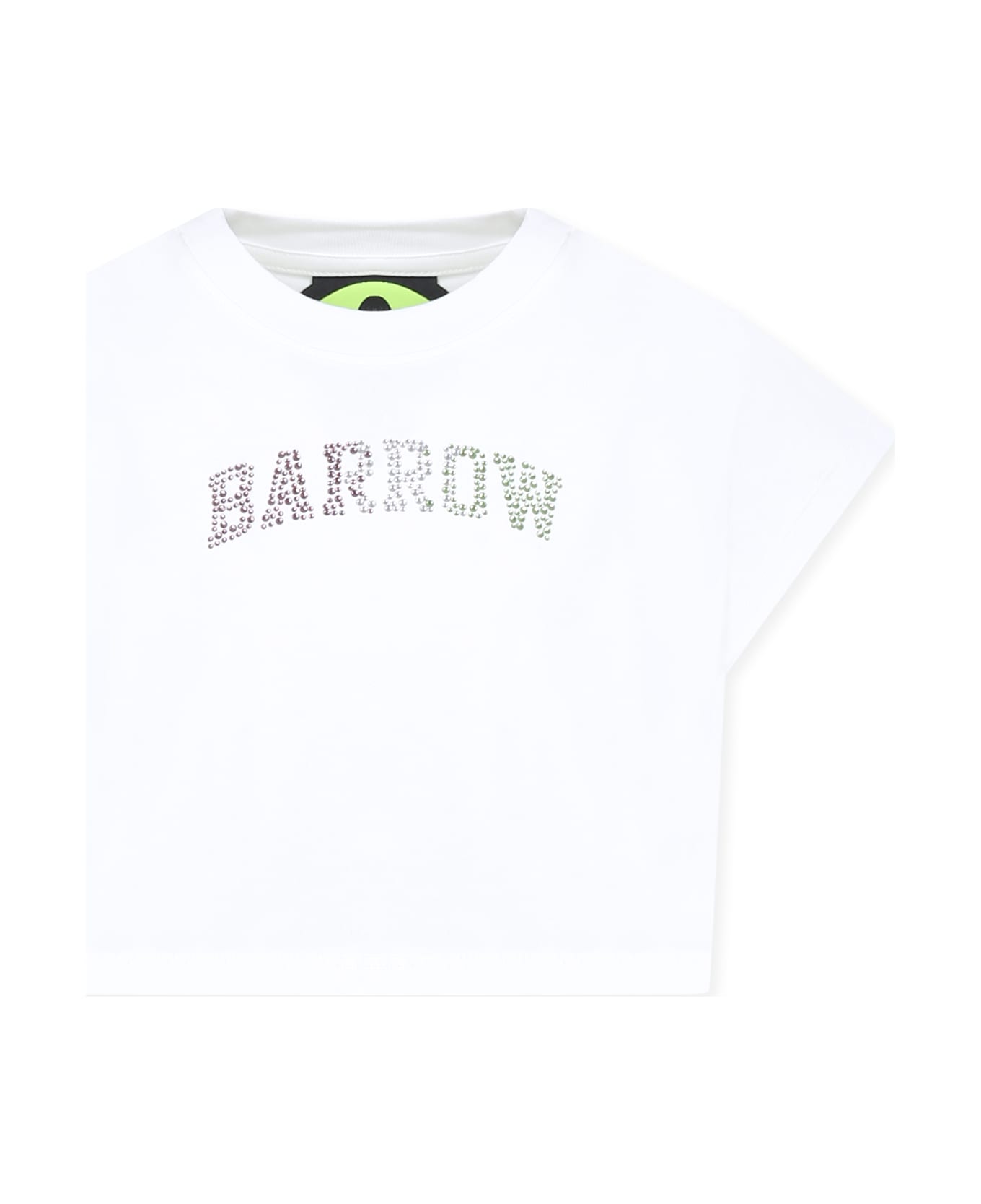 White cotton crop t-shirt, with short sleeves and ribbed crew neck. It is embellished with rhinestone logo on the front.