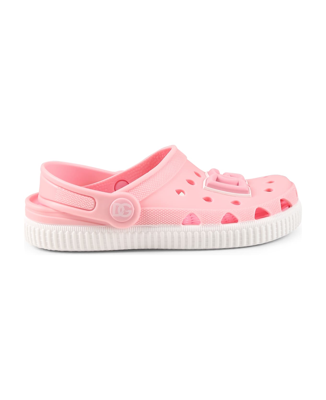 Pink mules from the luxury brand Dolce & Gabbana Kids, in PVC, with heel strap, ventilation holes on the front and round toe. They are embellished with DG logo on the front.