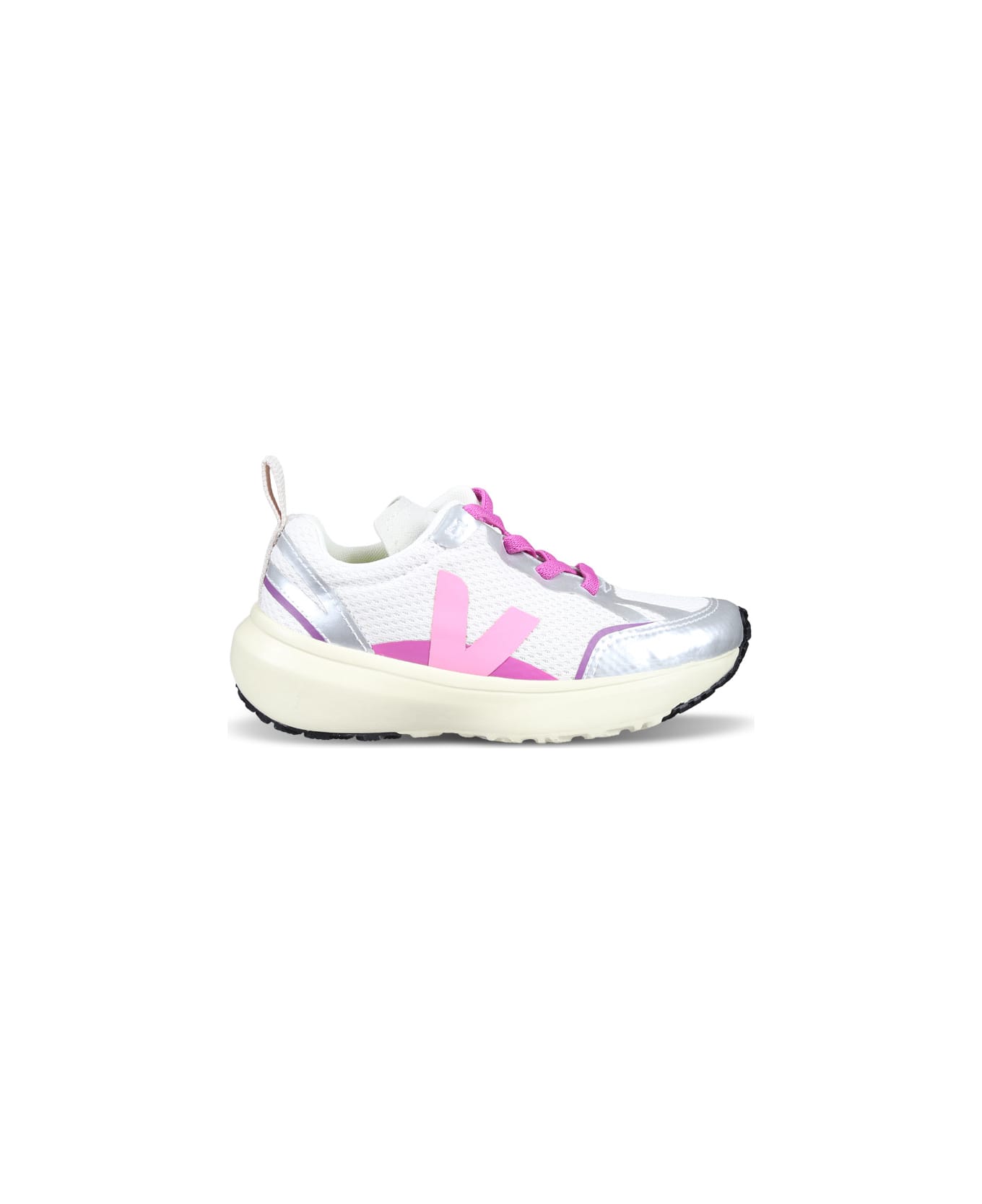 Silver sneakers with rubber sole, round toe, elastic lace closure. They are embellished with pink logo on the sides. They are made with eco-friendly and vegan materials.