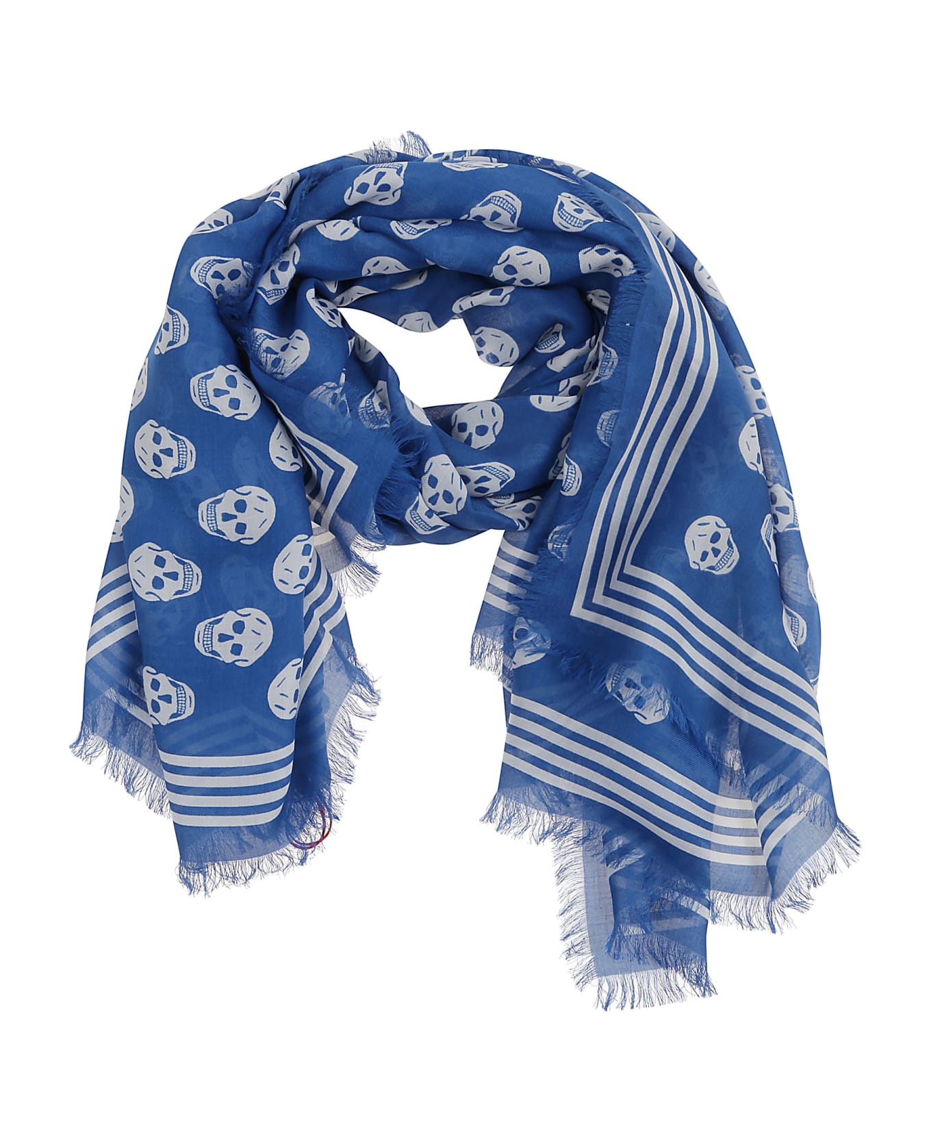 Skull print scarf by Alexander McQueen made of soft modal, skull print, striped edge, logo print on the front and raw cut edge. This article contains at least 50% low impact materials, certified or widely recognized as having a lower environmental impact.