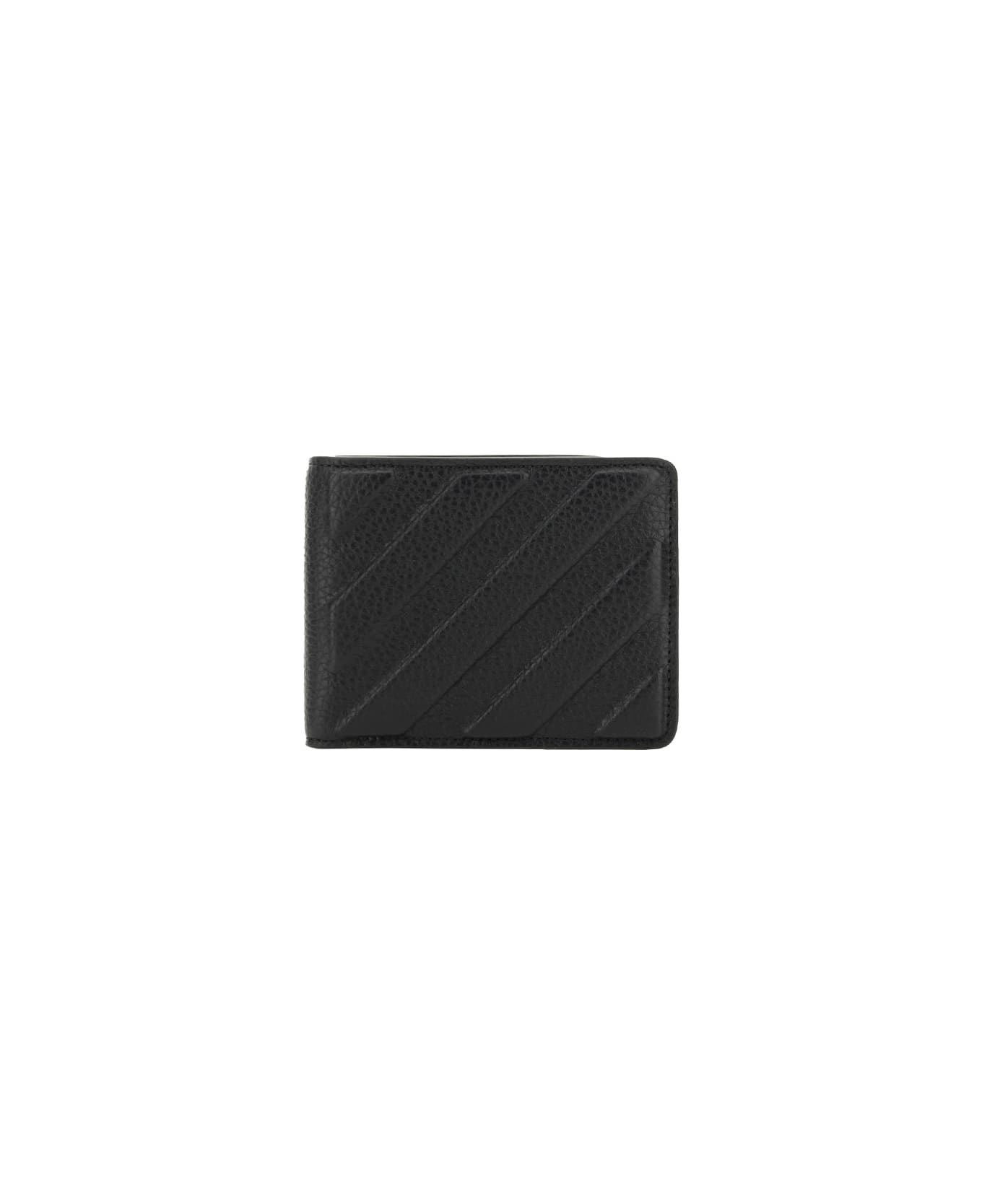 Calfskin binder wallet by off-white, billfold design, iconic brand embossed oblique bands on front and back, grained leather design, card slot inside, bill compartment, iconic brand monogram stamped on back.