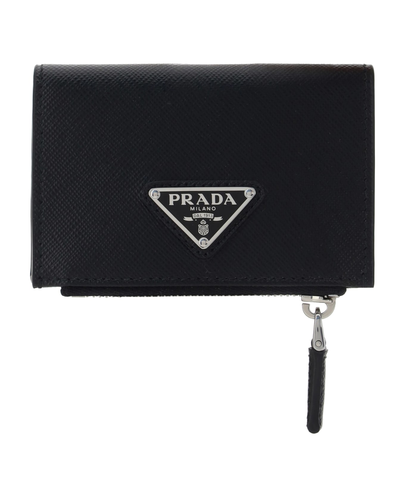Calfskin card case by prada, iconic triangular brand signature plaque embossed on the front, coin compartment with top zipper closure, interior card slot, snap closure. Composition: 100% % Calf Leather Bos Taurus