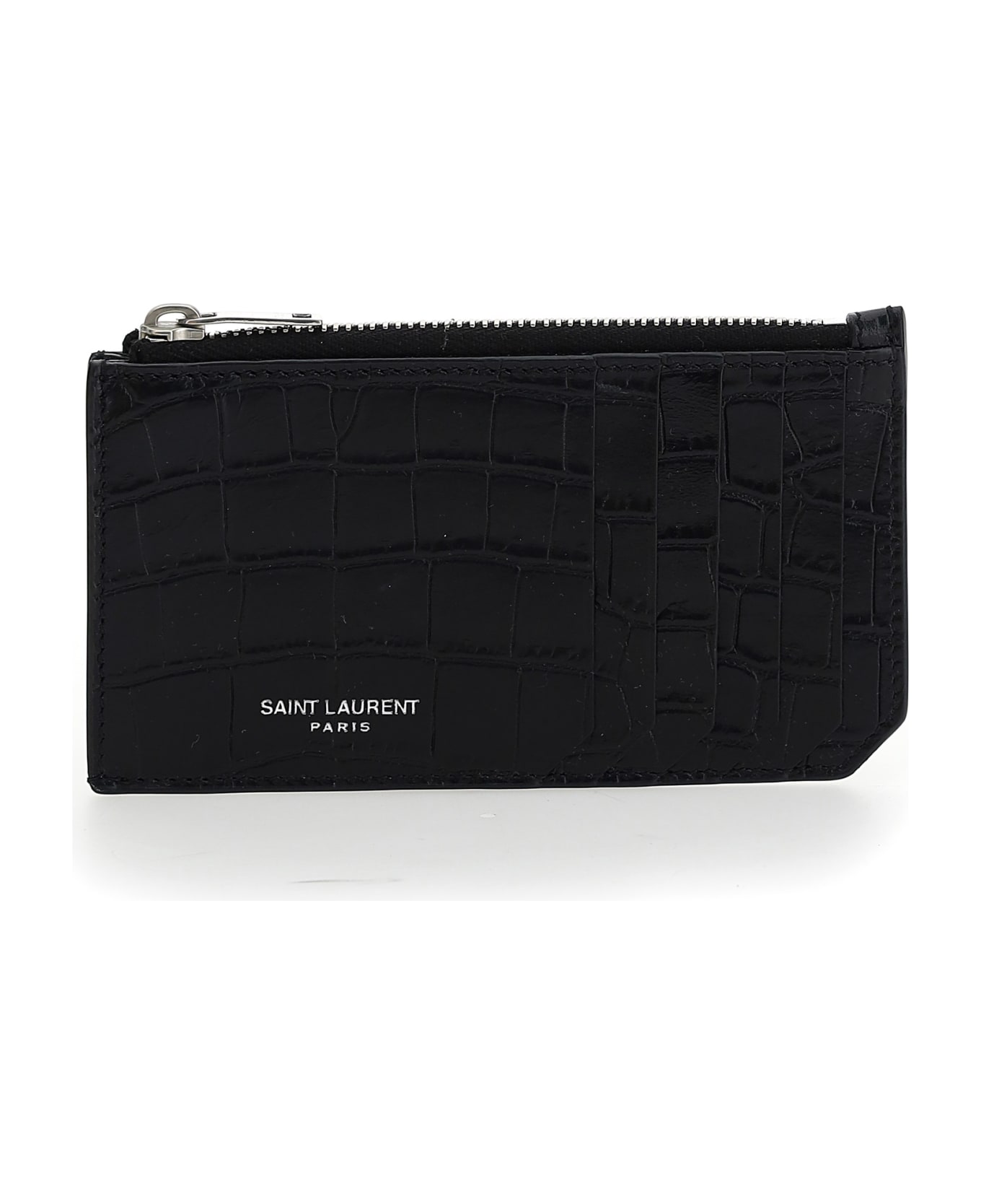 Calfskin card holder by saint laurent, croc print, card slot on front, logo printed on front, zip pocket on top. Composition: 100% % Calf Leather Bos Taurus