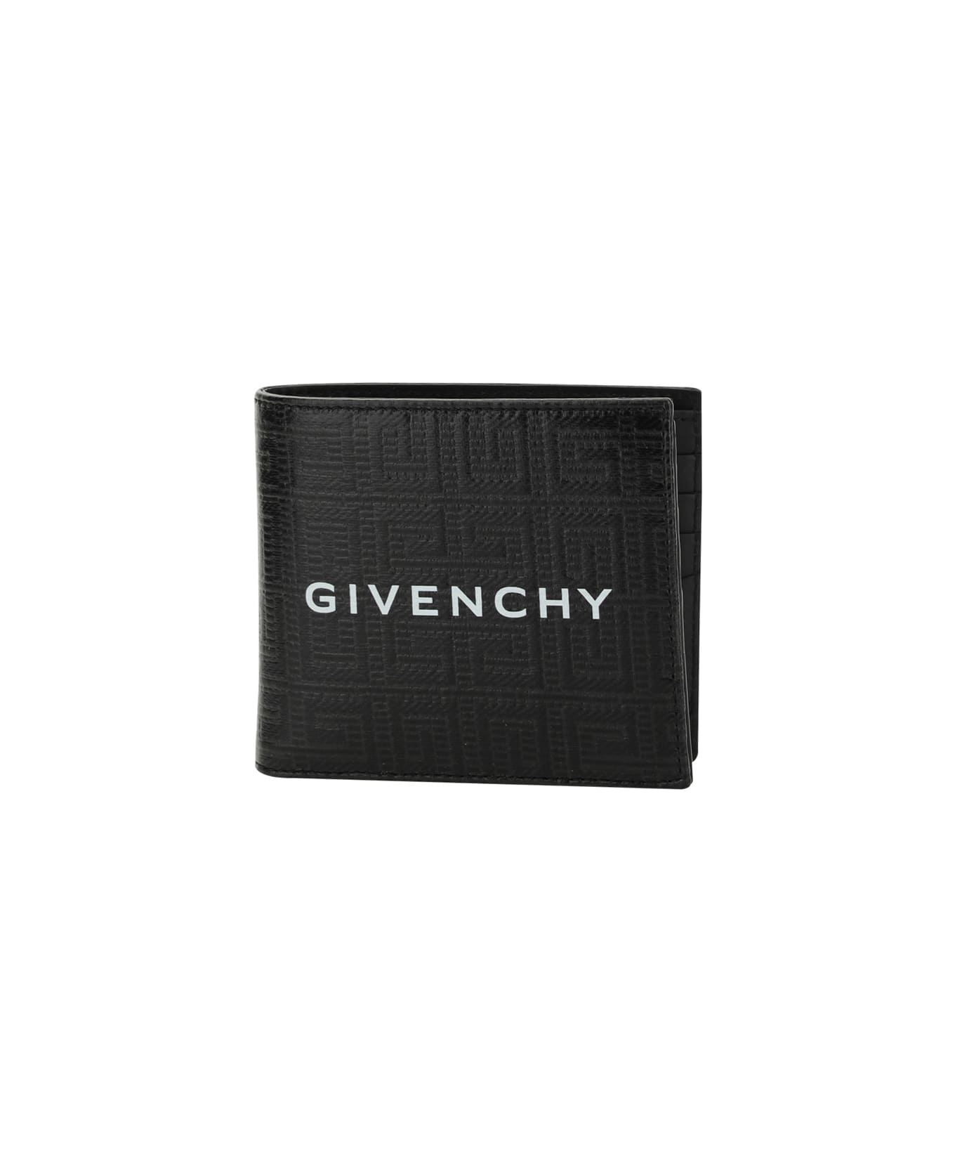 Wallet by givenchy, billfold design, card slot inside, bill compartment, coin pocket cin snap button for closure, iconic contrasting brand signature on front, iconic all-over embossed repeated 4g logo.