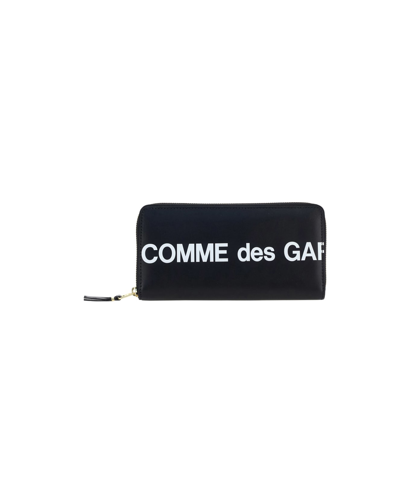 Calfskin wallet by comme des garcons, contrast logo on front and back, zip closure, internal card slots, bill compartment and snap button coin purse. Composition: 100% % Calf Leather Bos Taurus
