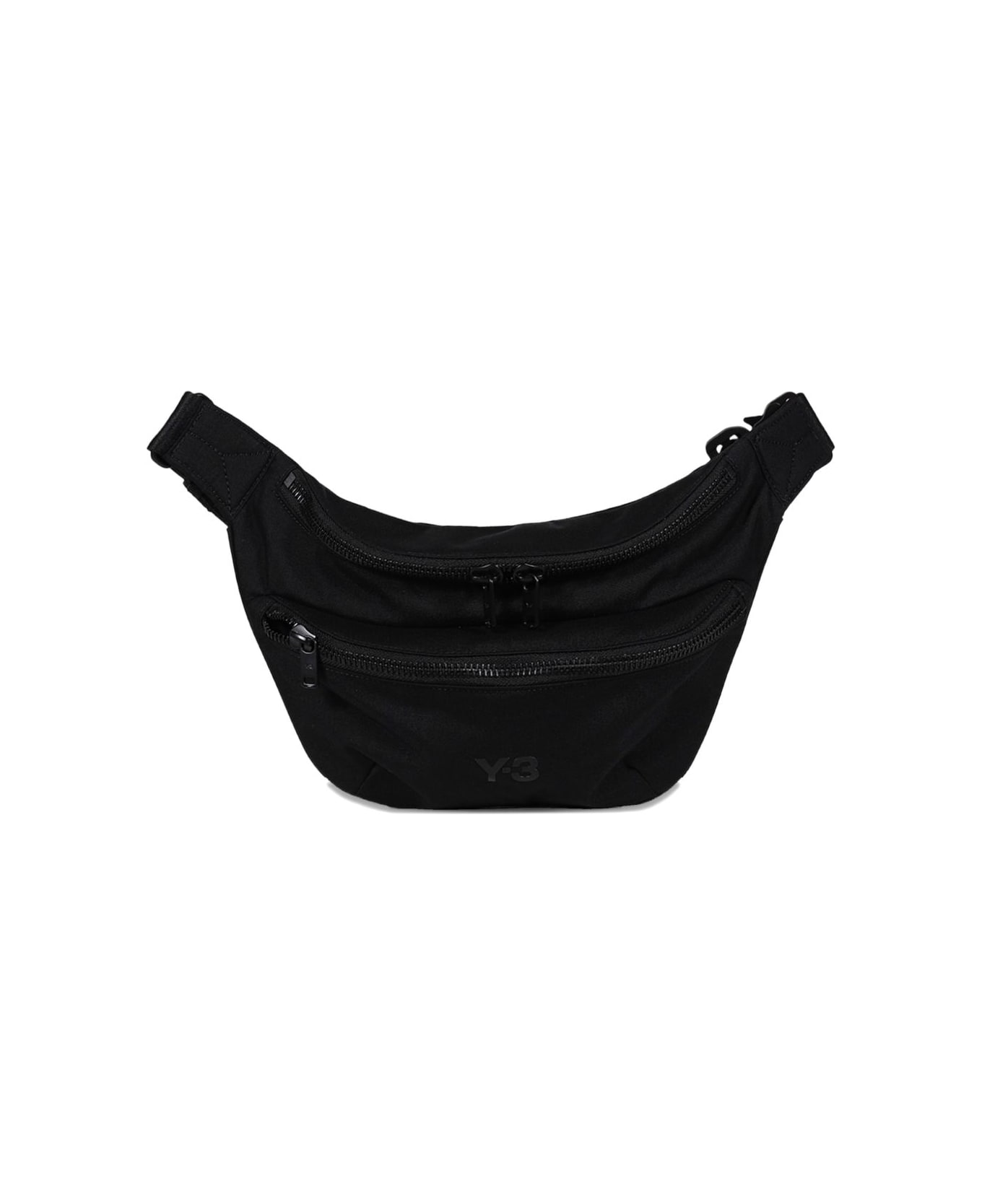black adjustable strap buckle fastening two zip compartments logo detail curved shape